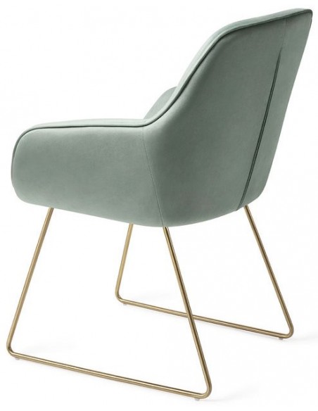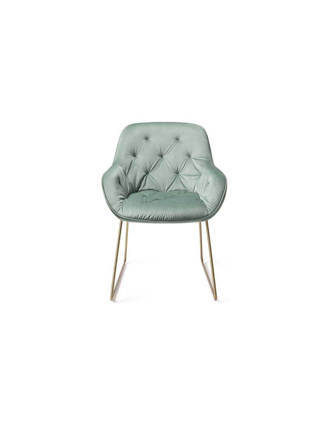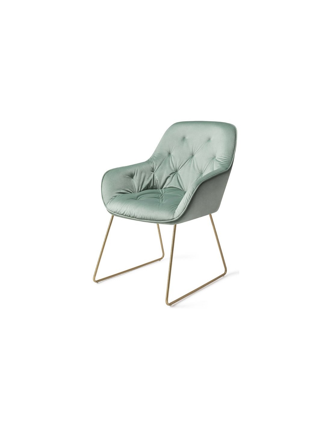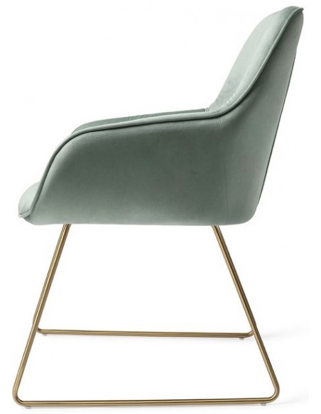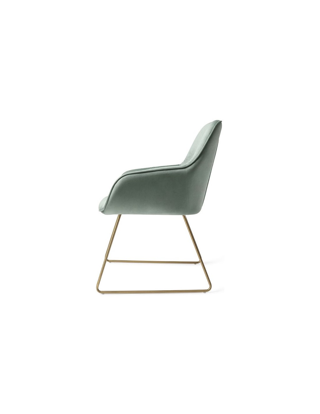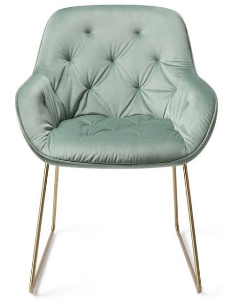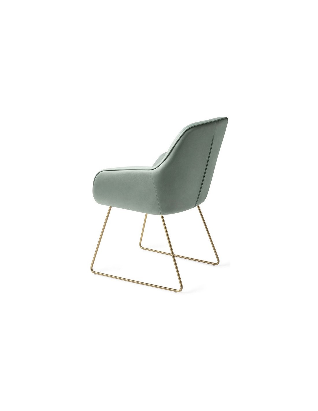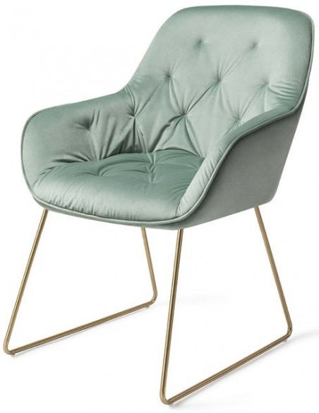 Sæt med 2 Tara spisebordsstole i et moderne design, fremstillet med sæde i jadegrøn velour og stel i guldfarvet metal. Stolen måler 84 cm i højden over ryggen og med siddehøjde på 48 cm.