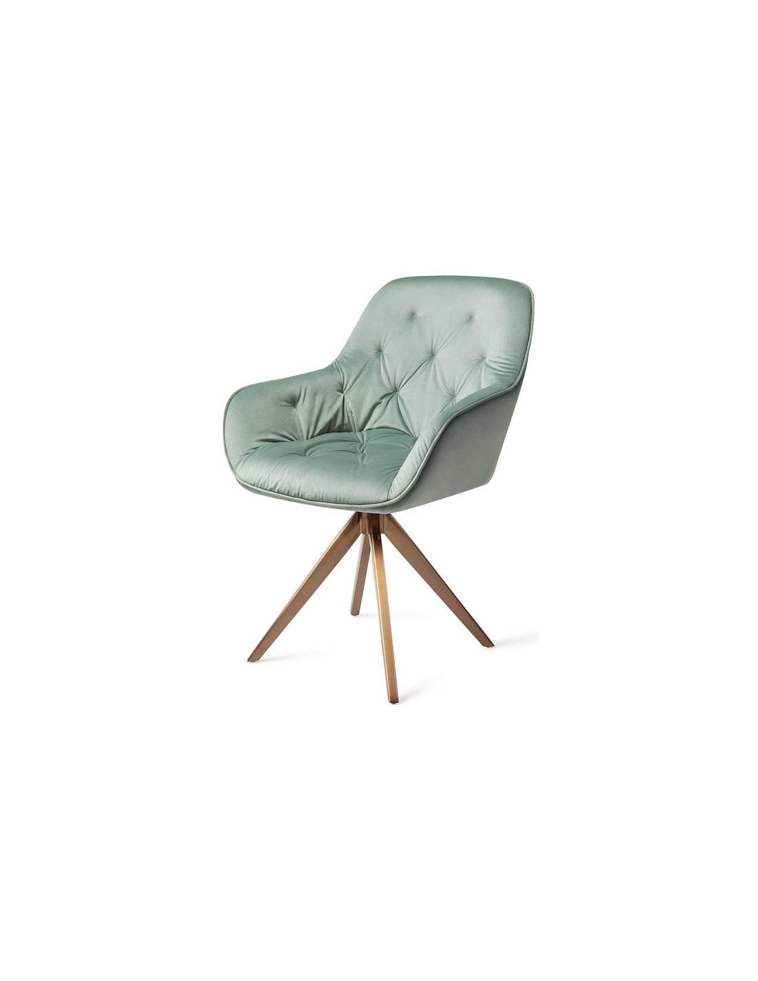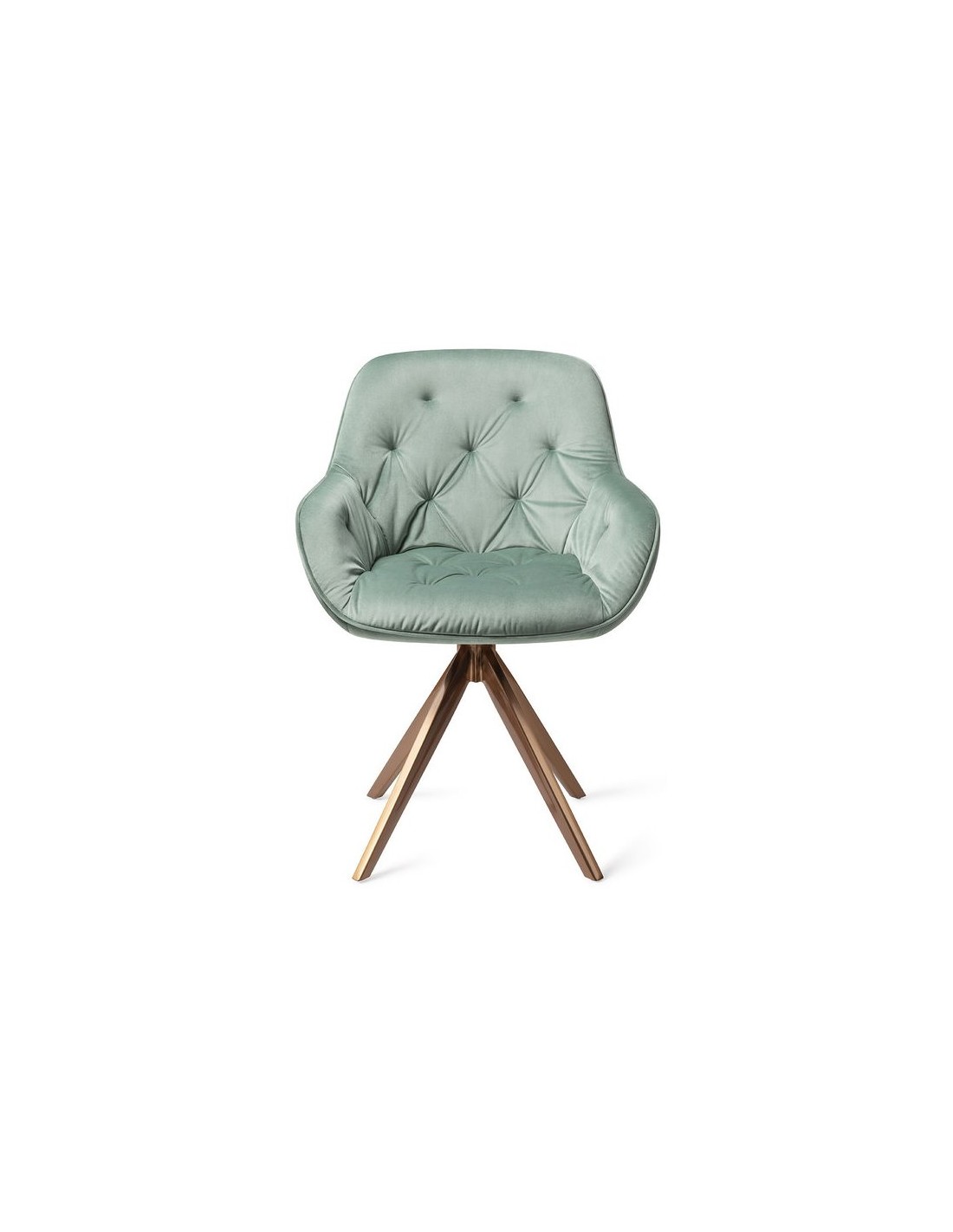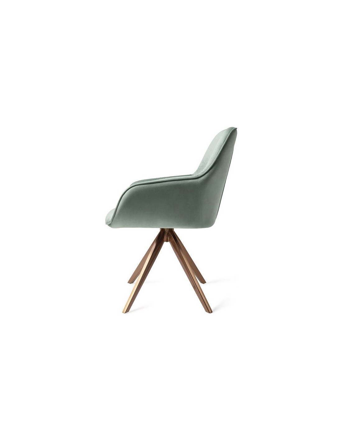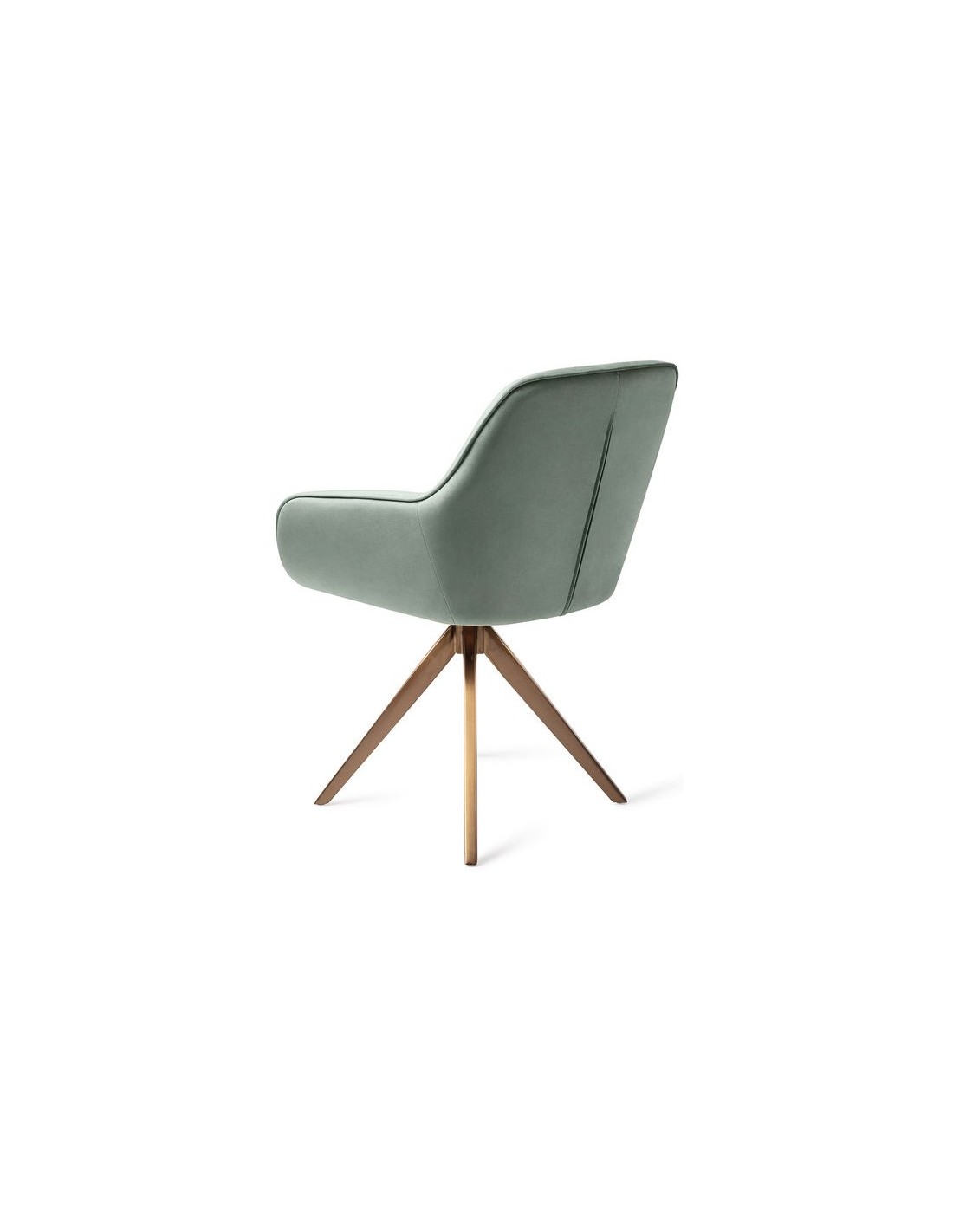 Sæt med 2 Tara spisebordsstole i et moderne design, fremstillet med sæde i jadegrøn velour og stel i rødguldfarvet metal. Stolen måler 84 cm i højden over ryggen og med siddehøjde på 48 cm. Stellet er rotérbart.