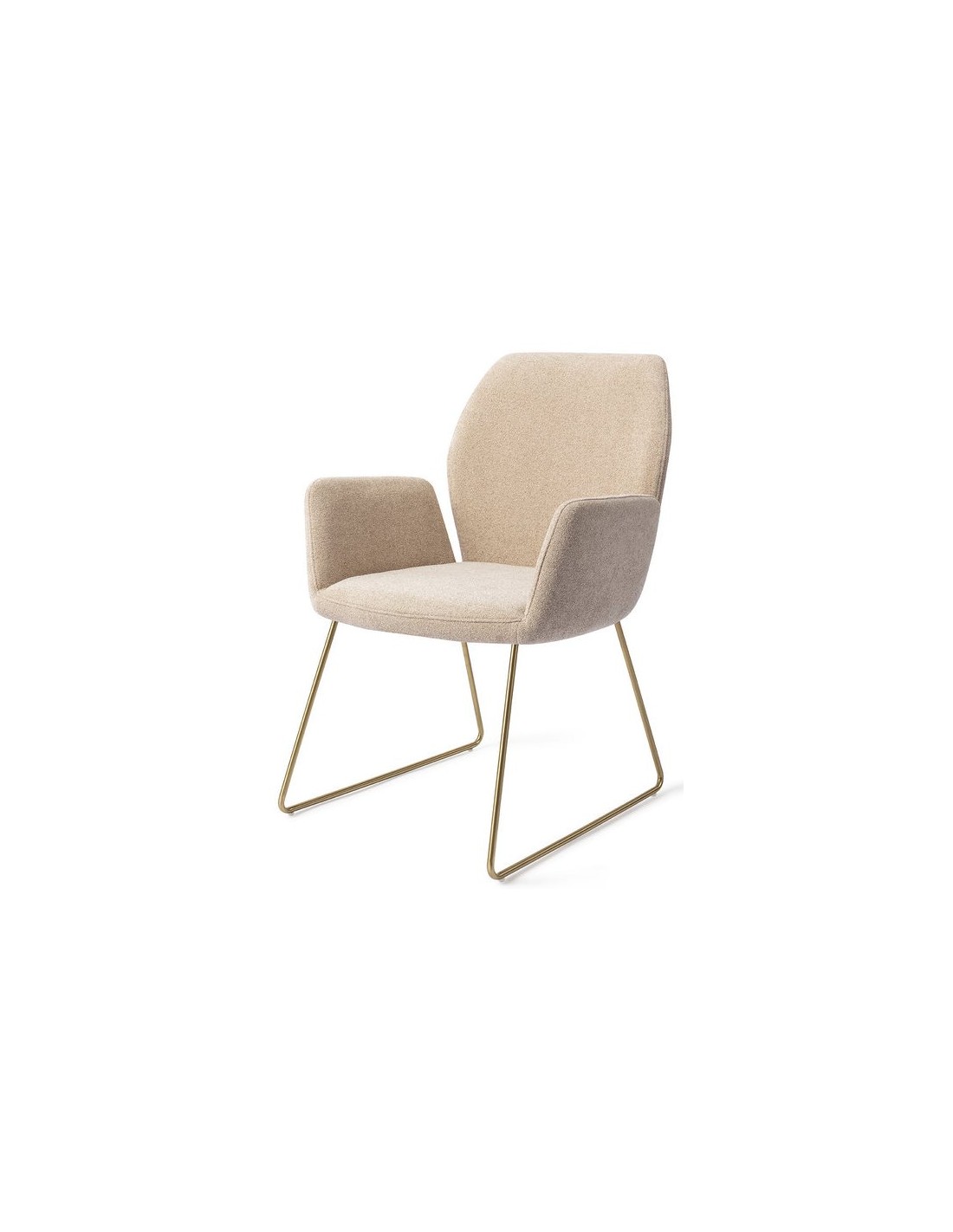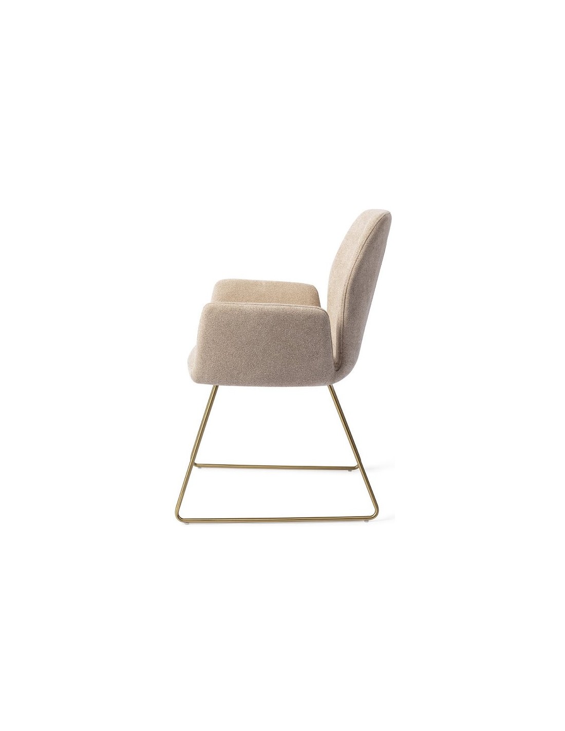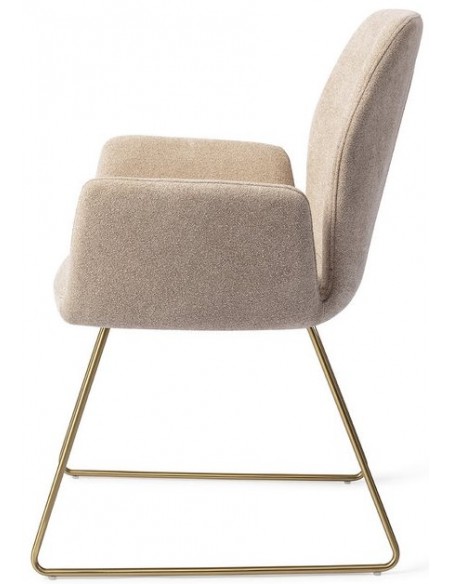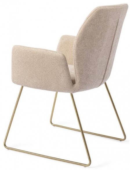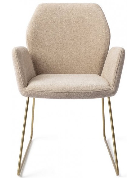 Sæt med 2 Misaki spisebordsstole i et moderne design, fremstillet med sæde i karamelfarvet polyester og stel i guldfarvet metal. Stolen måler 87 cm i højden over ryggen og med siddehøjde på 47,5 cm.