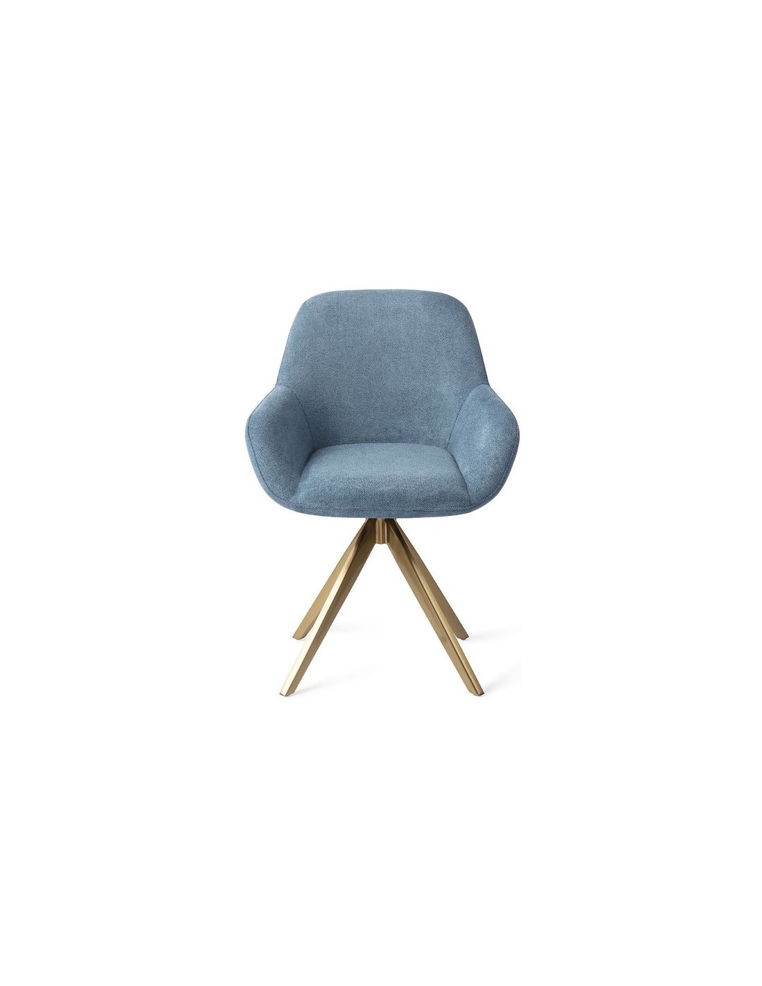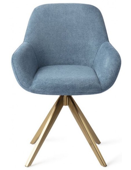 Sæt med 2 Kushi spisebordsstole i et moderne design, fremstillet med sæde i havblå polyester og stel i guldfarvet metal. Stolen måler 84 cm i højden over ryggen og med siddehøjde på 48 cm. Stellet er rotérbart.