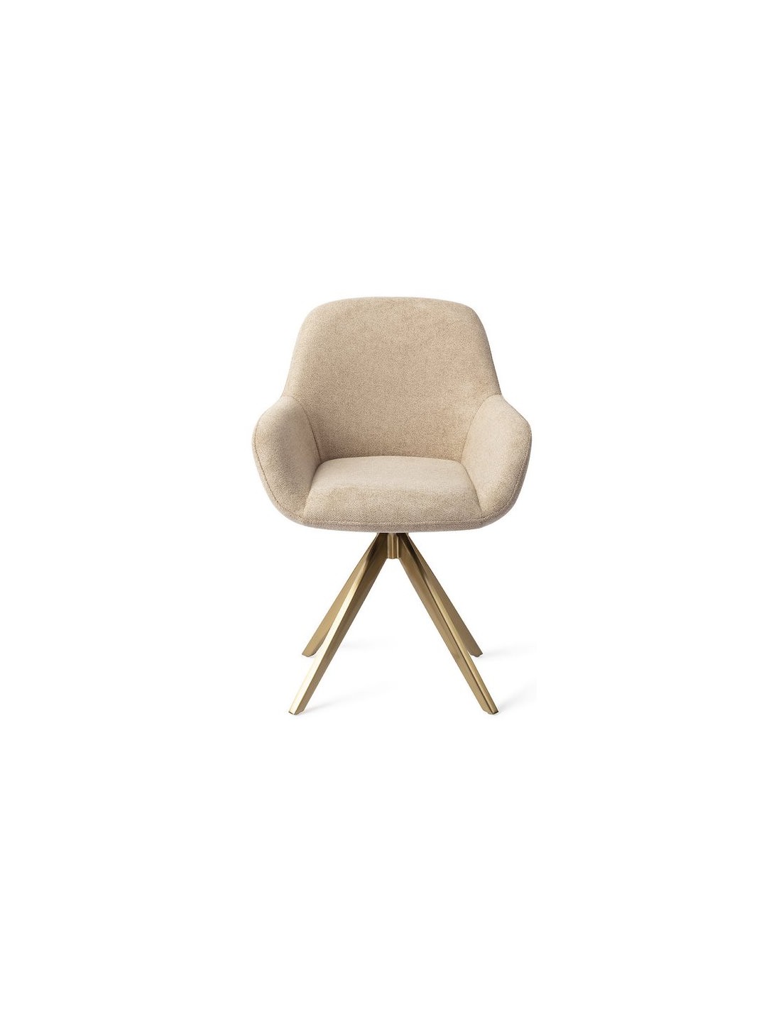 Sæt med 2 Kushi spisebordsstole i et moderne design, fremstillet med sæde i sandfarvet polyester og stel i guldfarvet metal. Stolen måler 84 cm i højden over ryggen og med siddehøjde på 48 cm. Stellet er rotérbart.
