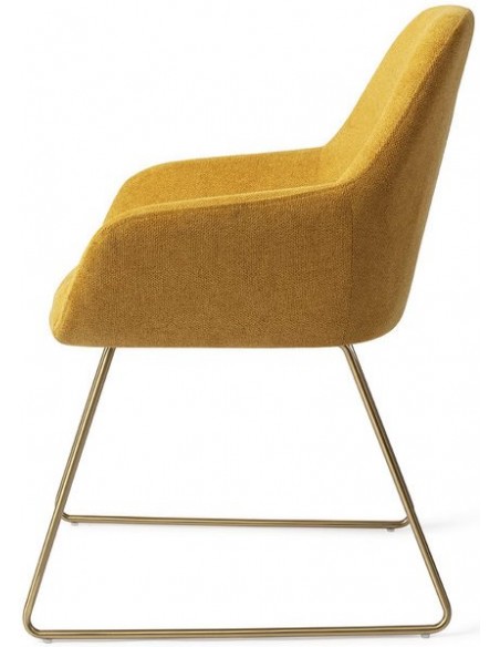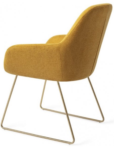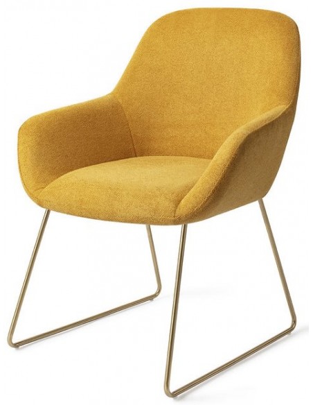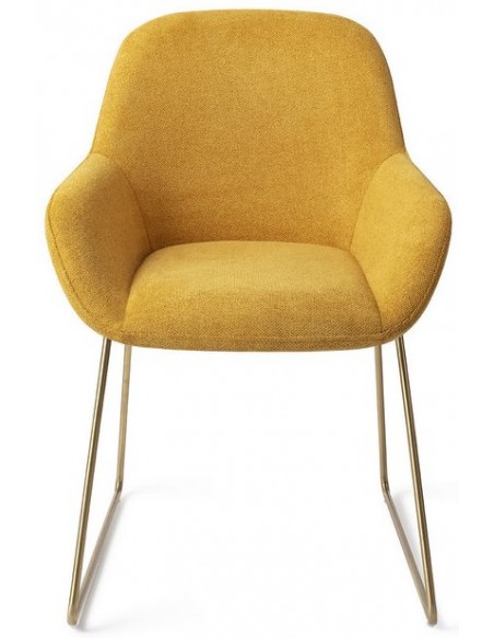 Sæt med 2 Kushi spisebordsstole i et moderne design, fremstillet med sæde i korngul polyester og stel i guldfarvet metal. Stolen måler 84 cm i højden over ryggen og med siddehøjde på 48 cm.
