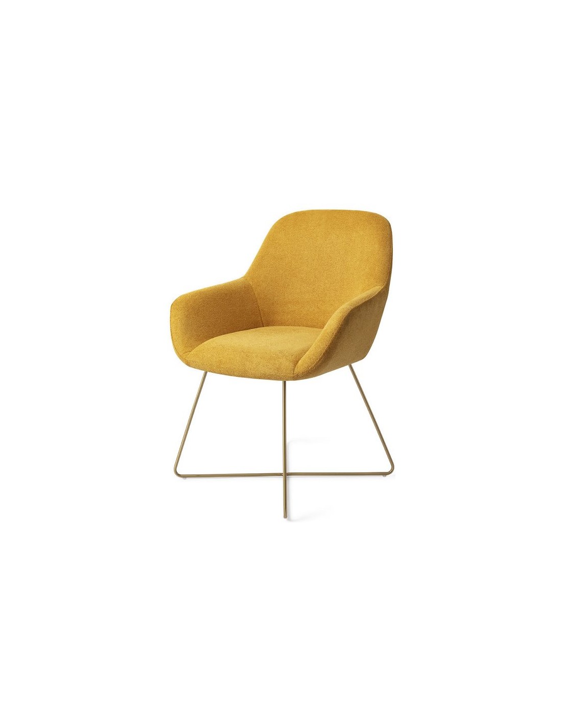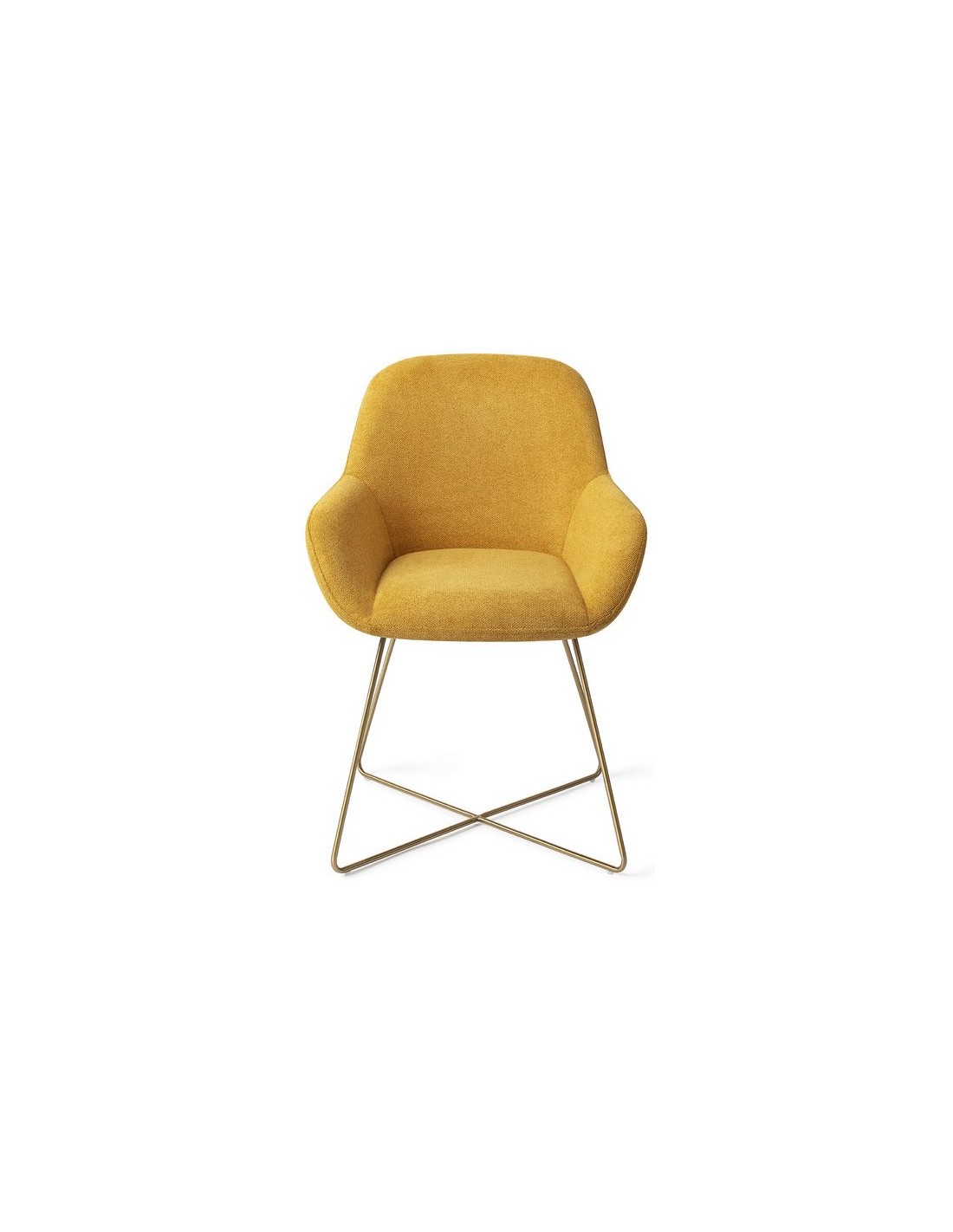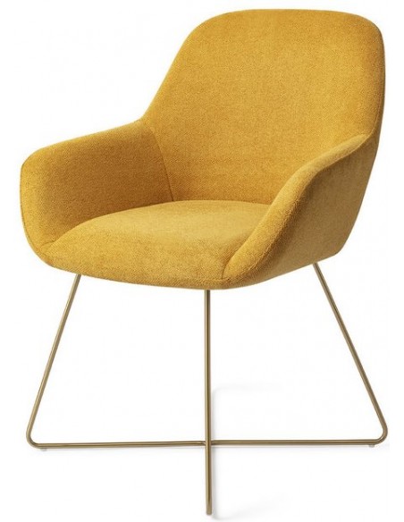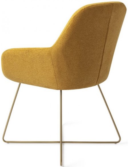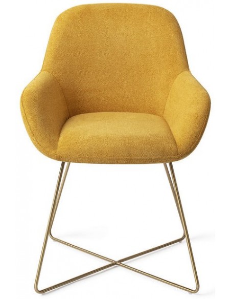 Sæt med 2 Kushi spisebordsstole i et moderne design, fremstillet med sæde i korngul polyester og stel i guldfarvet metal. Stolen måler 84 cm i højden over ryggen og med siddehøjde på 48 cm.