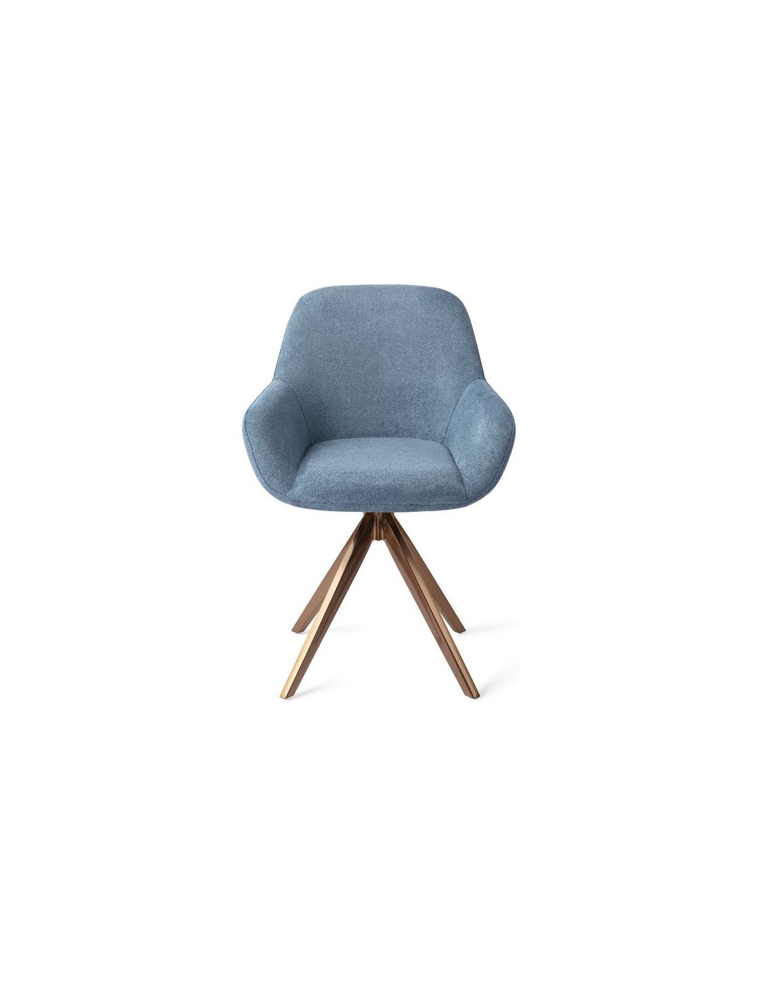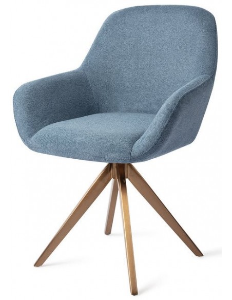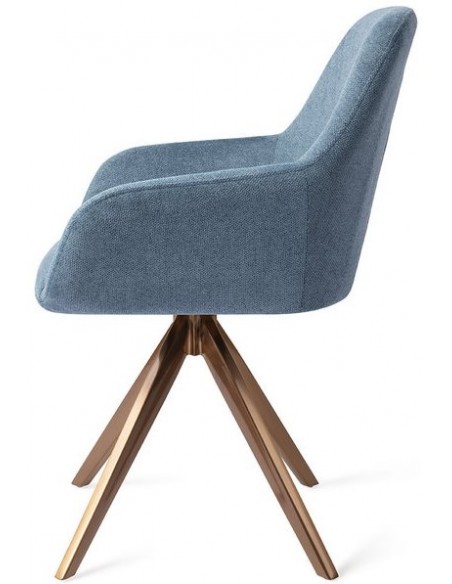 Sæt med 2 Kushi spisebordsstole i et moderne design, fremstillet med sæde i havblå polyester og stel i rødguldfarvet metal. Stolen måler 84 cm i højden over ryggen og med siddehøjde på 48 cm. Stellet er rotérbart.
