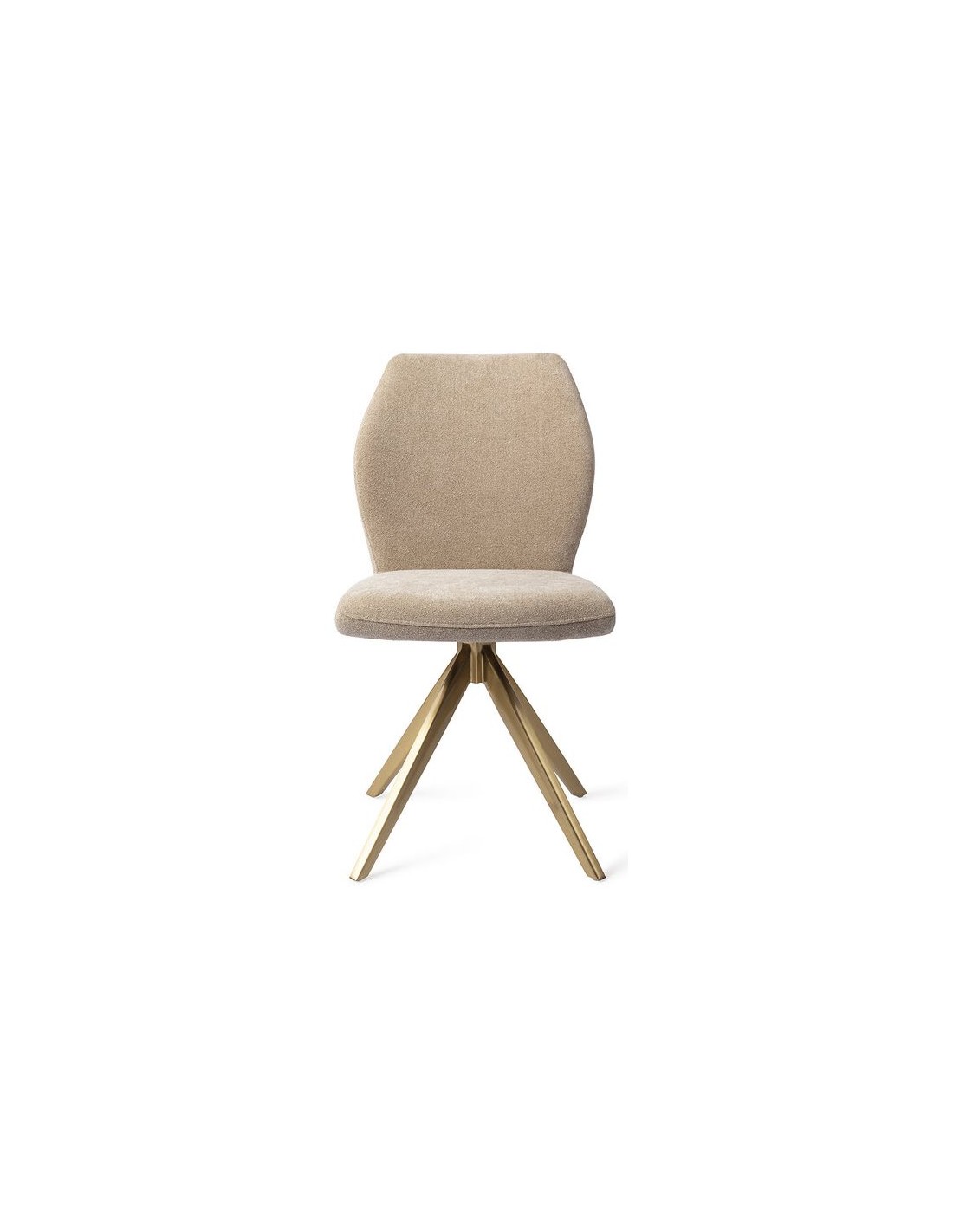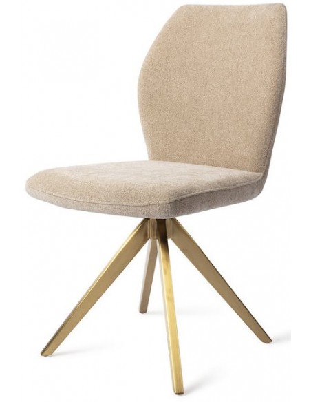 Sæt med 2 Ikata spisebordsstole i et moderne design, fremstillet med sæde i karamelfarvet polyester og stel i guldfarvet metal. Stolen måler 87 cm i højden over ryggen og med siddehøjde på 47,5 cm. Stellet er rotérbart.