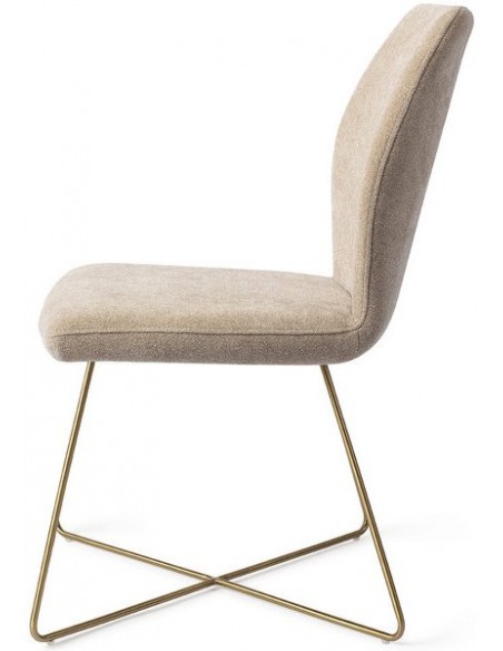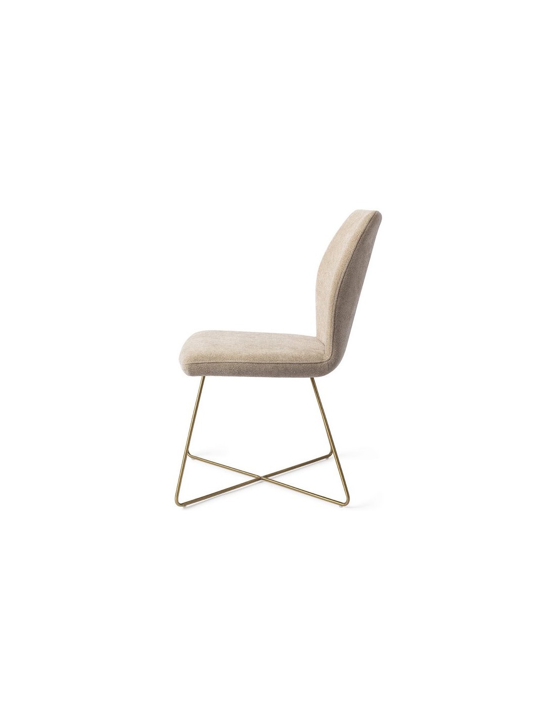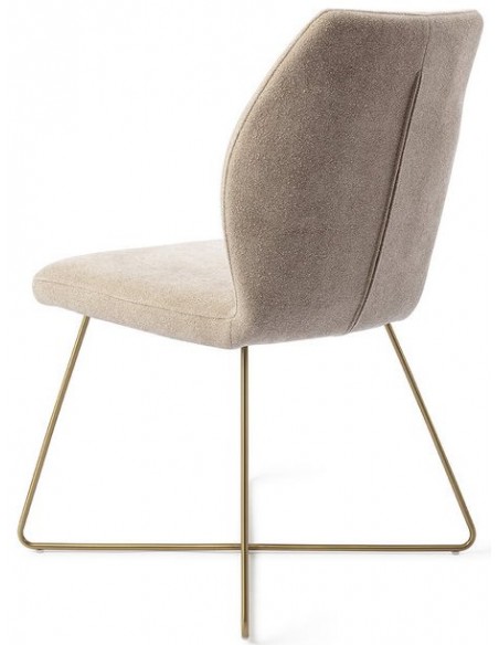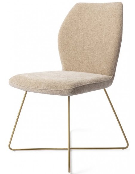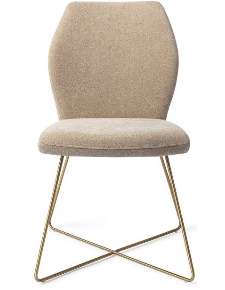 Sæt med 2 Ikata spisebordsstole i et moderne design, fremstillet med sæde i karamelfarvet polyester og stel i guldfarvet metal. Stolen måler 87 cm i højden over ryggen og med siddehøjde på 47,5 cm.