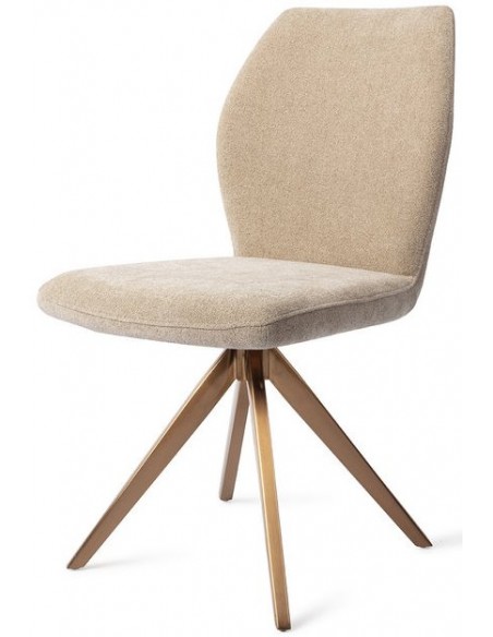 Sæt med 2 Ikata spisebordsstole i et moderne design, fremstillet med sæde i karamelfarvet polyester og stel i rødguldfarvet metal. Stolen måler 87 cm i højden over ryggen og med siddehøjde på 47,5 cm. Stellet er rotérbart.