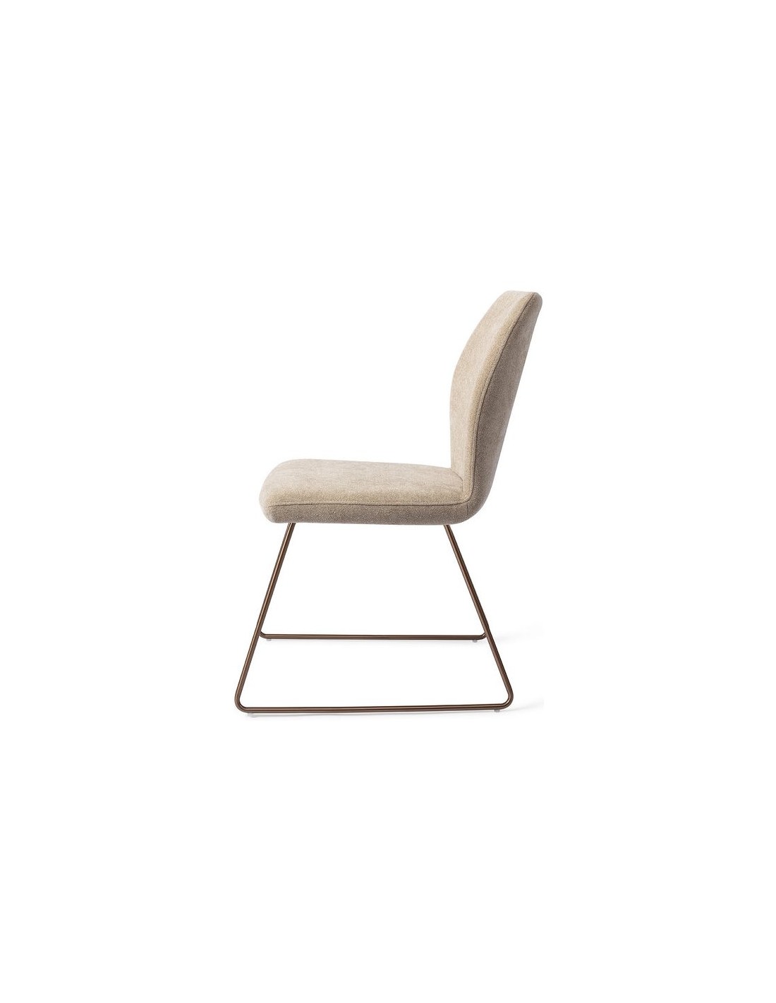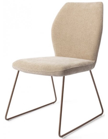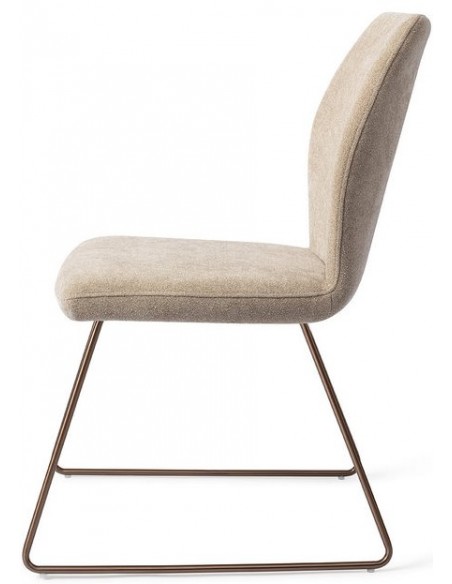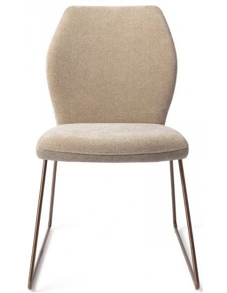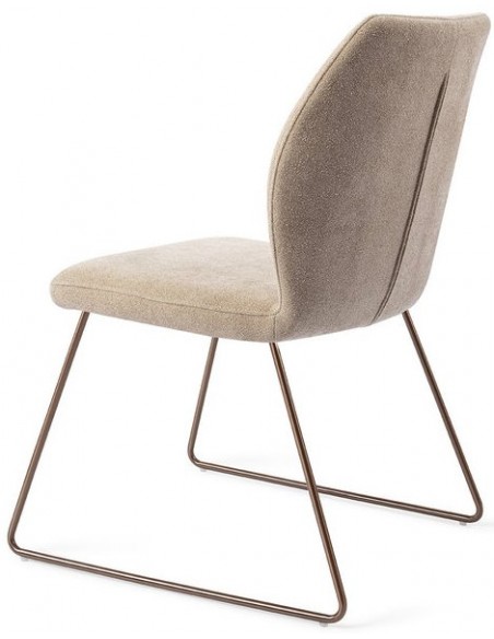 Sæt med 2 Ikata spisebordsstole i et moderne design, fremstillet med sæde i karamelfarvet polyester og stel i rødguldfarvet metal. Stolen måler 87 cm i højden over ryggen og med siddehøjde på 47,5 cm.