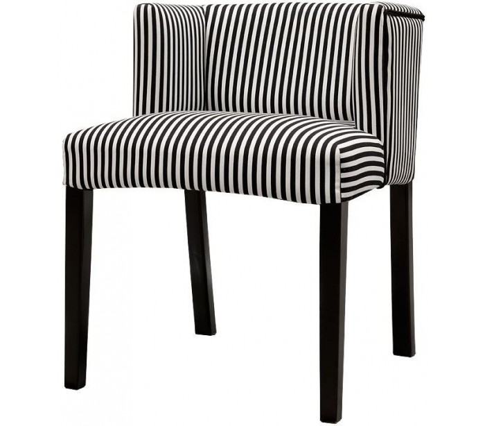 Spisebordsstol udført i et design i sort og hvid stribet polyester og med ben i sortlakeret træ. Stolen måler 68 cm i højden over ryggen og med en siddehøjde på 45 cm.