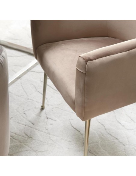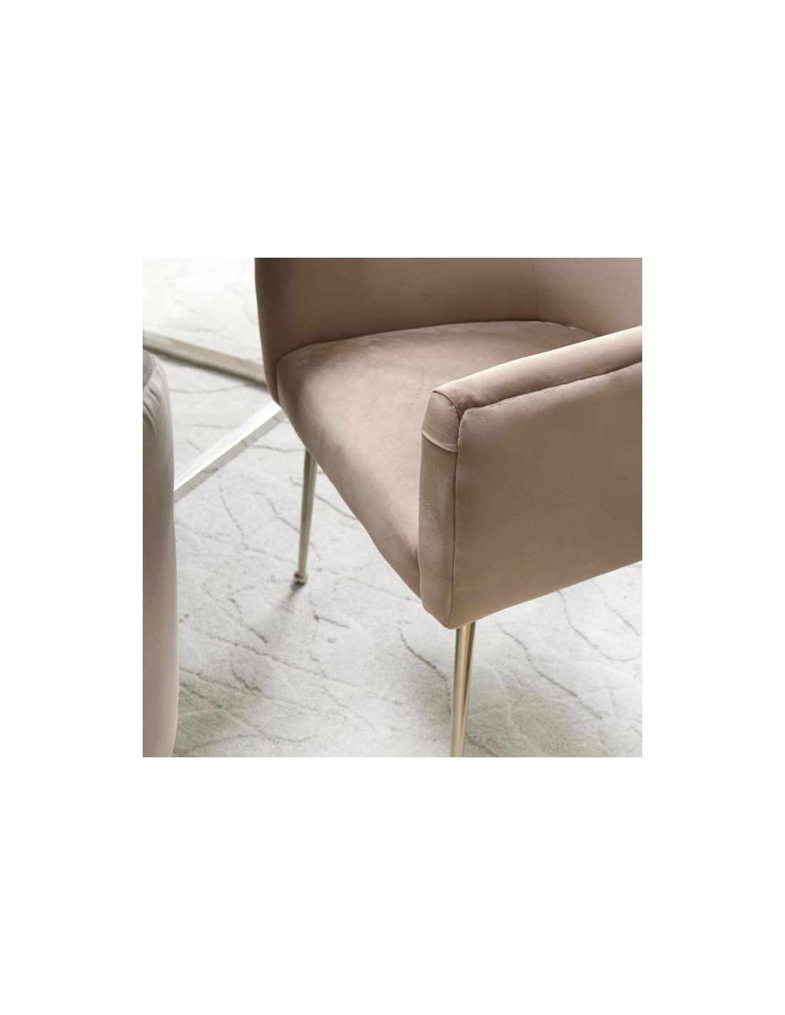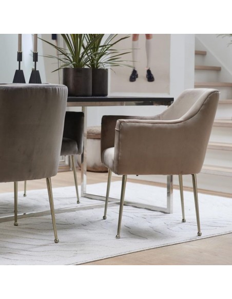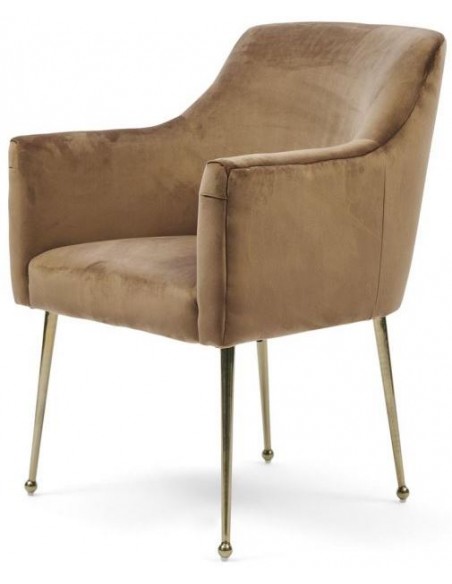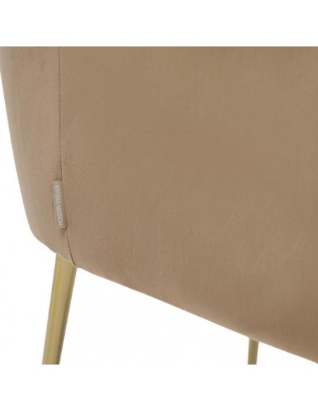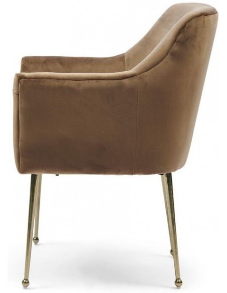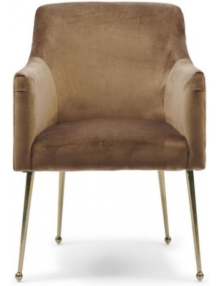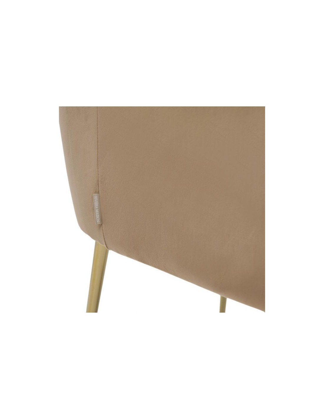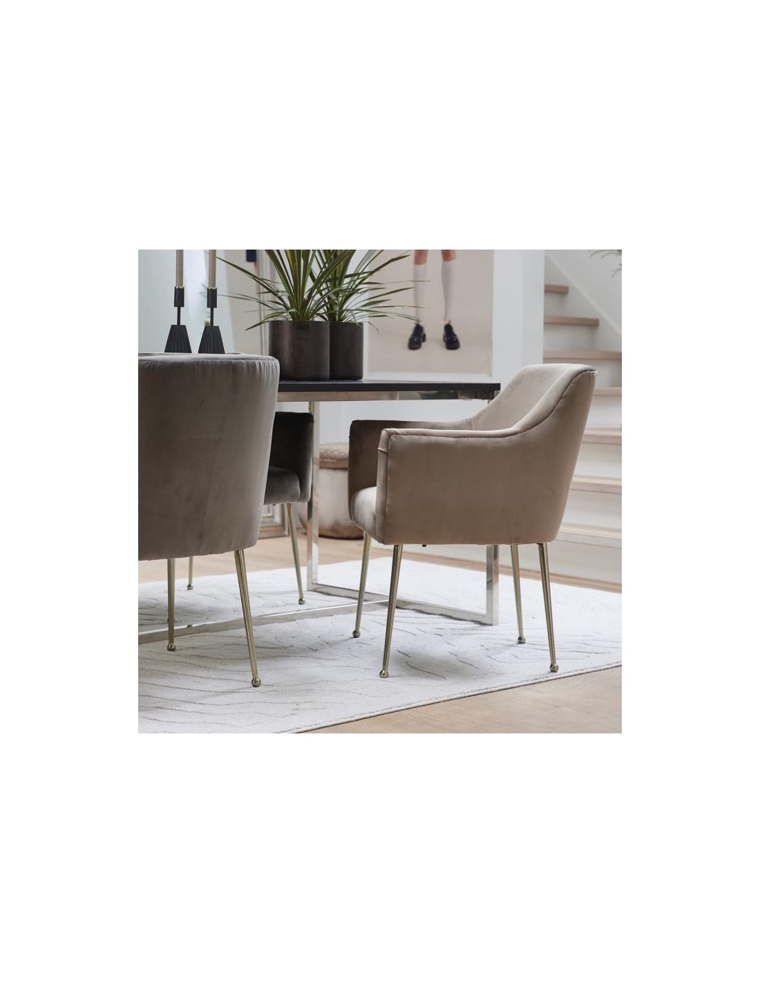 Riviera Maison spisebordsstol udført i et design af minkbrun velour og antik guldfarvet jern. Spisebordsstolen måler 84 cm i højden over ryggen og 66 x 66 cm i bredde og dybde. Siddehøjden er 48 cm.