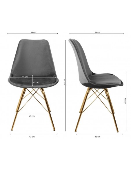 Spisebordsstol udført i et design af metal og velour. Stolen måler 85 cm i højden over ryggen og 48 cm i siddehøjde.