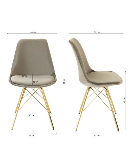 Spisebordsstol udført i et design af metal og velour. Stolen måler 85 cm i højden over ryggen og 48 cm i siddehøjde.