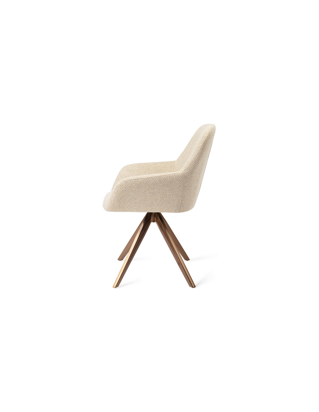 Sæt med 2 Kushi spisebordsstole i et moderne design, fremstillet med sæde i meleret korngul polyester og stel i rødguldfarvet metal. Stolen måler 84 cm i højden over ryggen og med siddehøjde på 48 cm. Stellet er rotérbart.