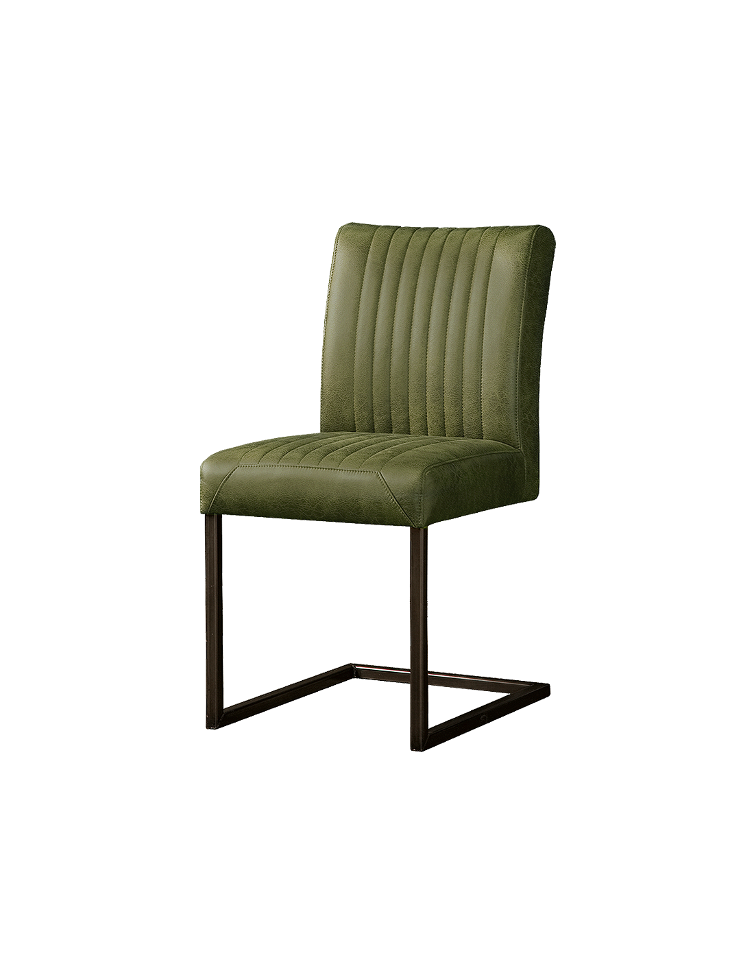 Spisebordsstol udført i et industrielt design af vintage grøn microfiber og stel i antik metalgrå lakeret metal. Stolen måler 88 cm i højden over ryggen og 47 cm i bredden og er polstret med højkvalitets skum.