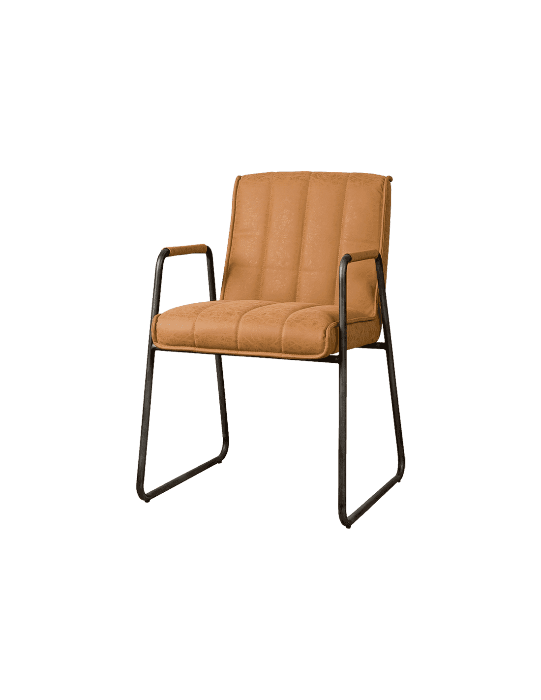 Spisebordsstol udført i et industrielt design af vintage cognac microfiber og stel i sortlakeret metal. Stolen måler 85 cm i højden over ryggen og 47 cm i bredden og er polstret med højkvalitets skum.
