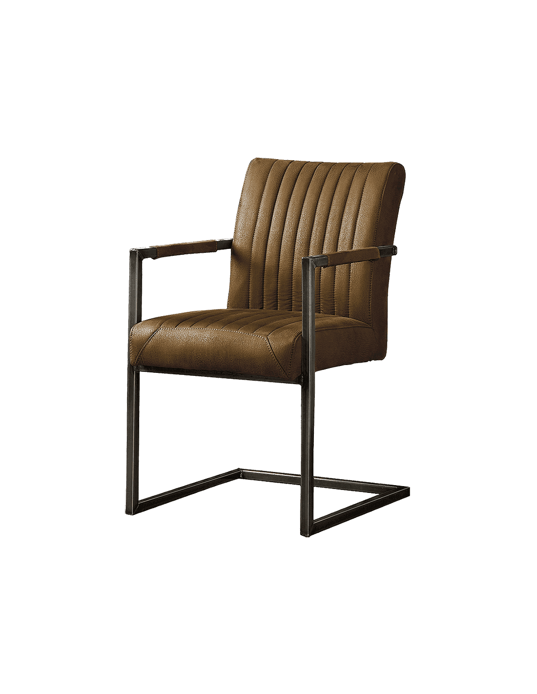 Spisebordsstol udført i et industrielt design af vintage lysebrun microfiber og stel i antik metalgrå lakeret metal. Stolen måler 88 cm i højden over ryggen og 52 cm i bredden og er polstret med højkvalitets skum.