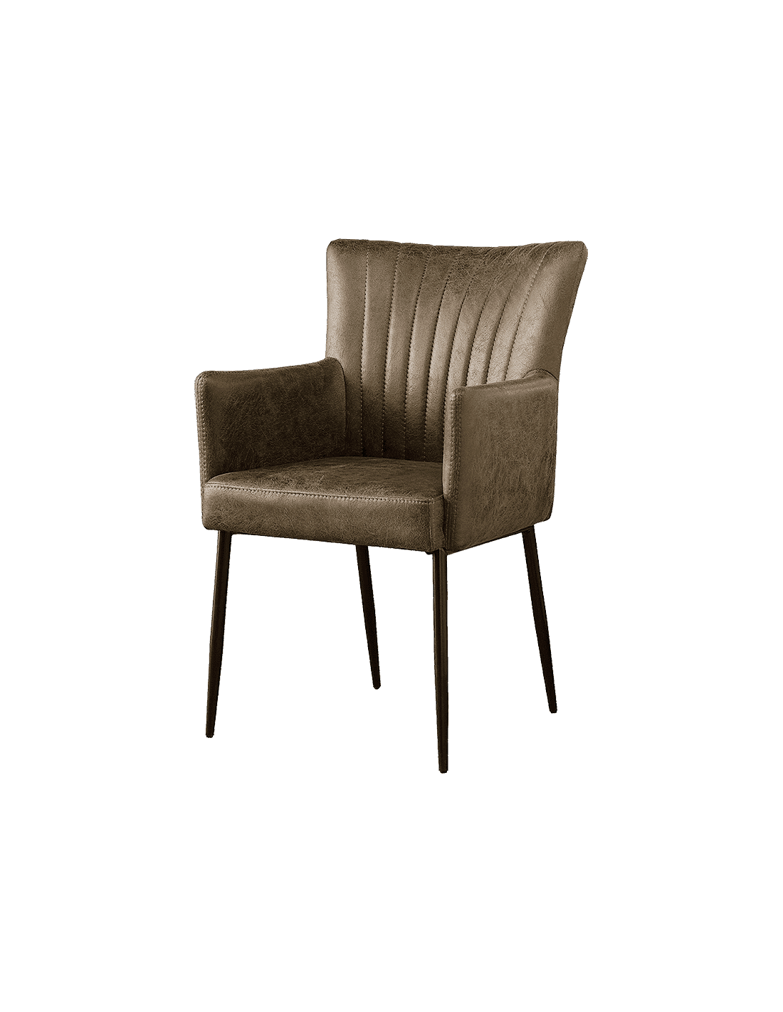 Spisebordsstol udført i et industrielt design af vintage lysebrun microfiber og stel i sortlakeret metal. Stolen måler 89 cm i højden over ryggen og 56 cm i bredden og er polstret med højkvalitets skum.