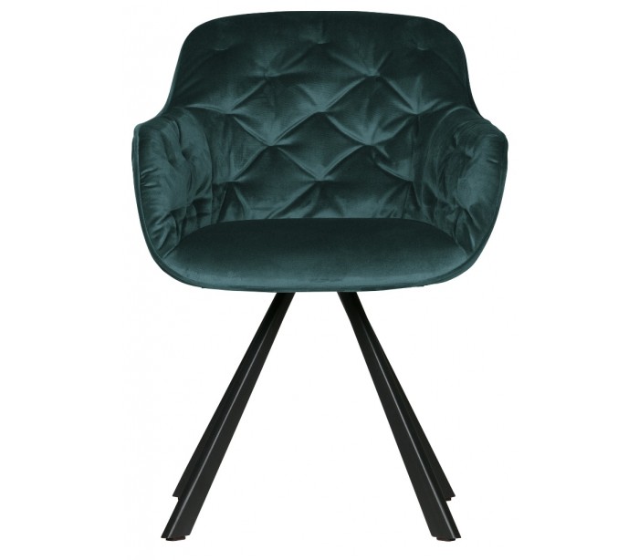 Spisebordsstol i et moderne design, fremstillet i mørkt blågrønt velour, og med ben i sortlakeret metal. Stolen måler 80,5 cm i højden og 59,5 x 59 cm i bredde og dybde. Siddehøjden er 49 cm.