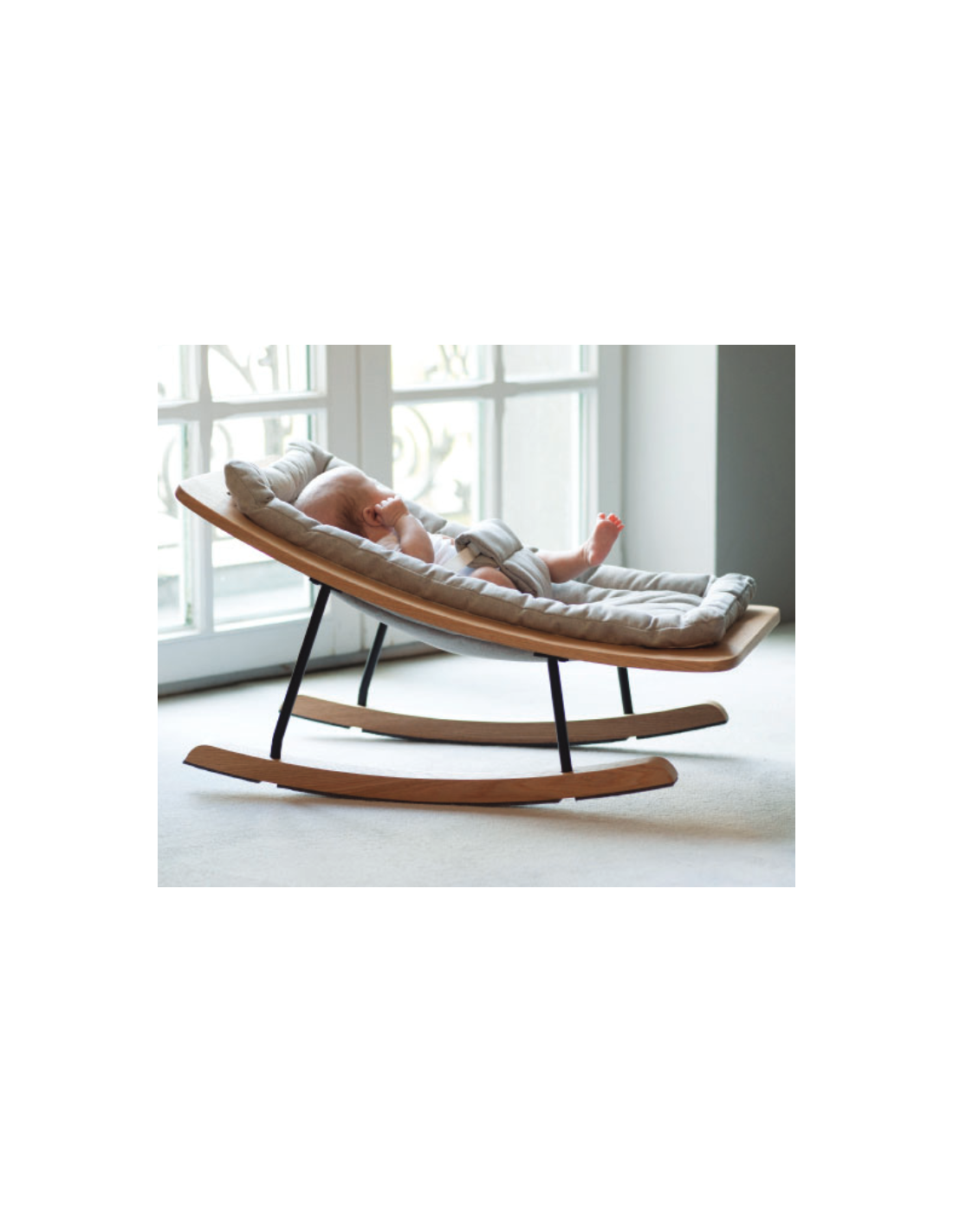 Rocking Baby Bouncer fra Belgiske Quax, udført i et moderne design og fremstillet i lækre materialer. Stolen måler 41 cm i højden og kommer med blød hynde med sikkerhedsspænde.