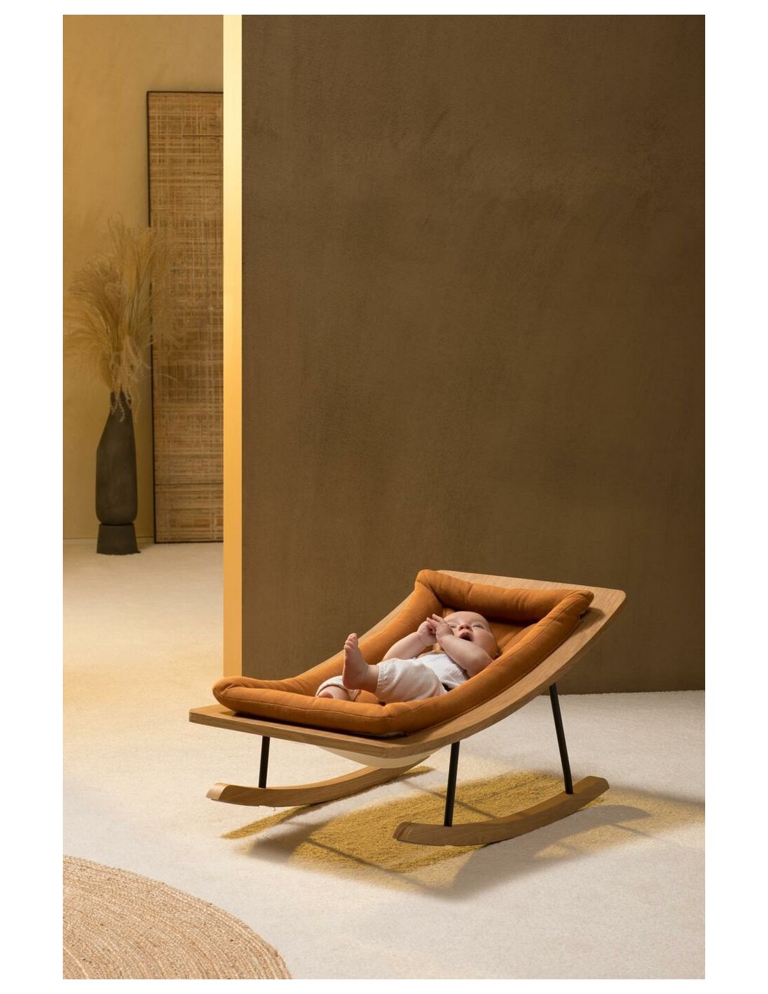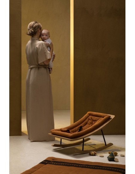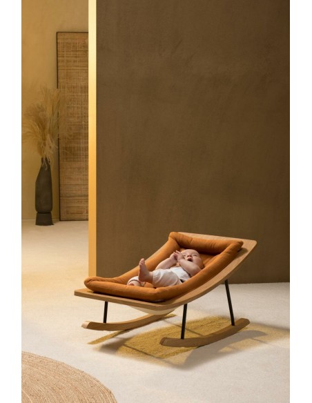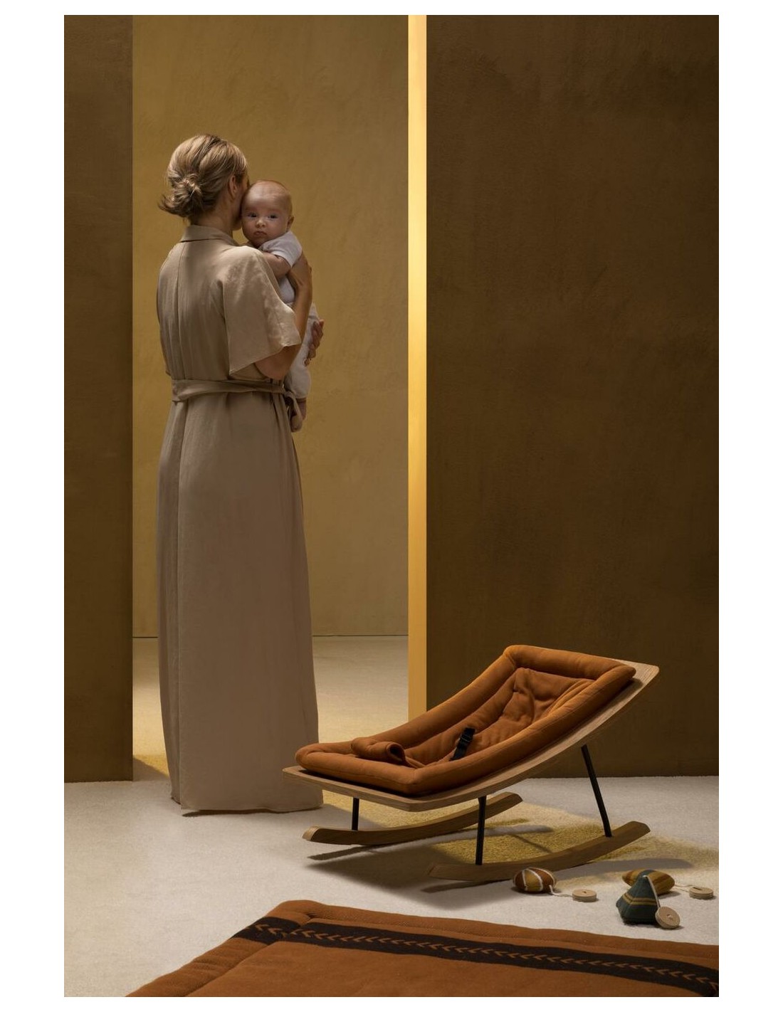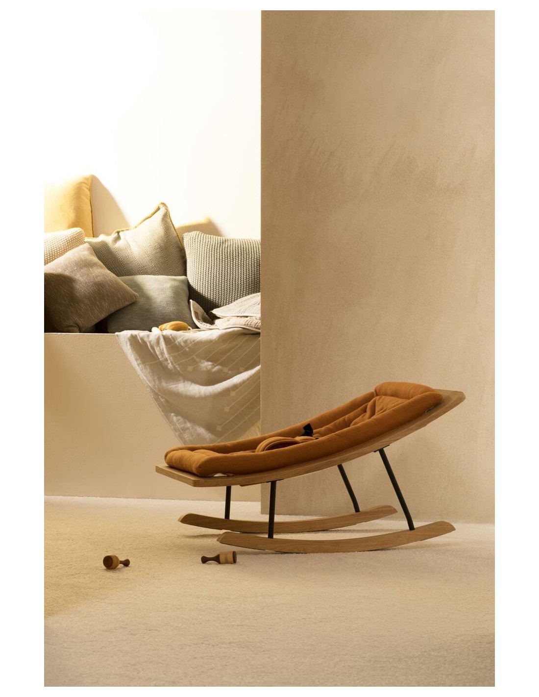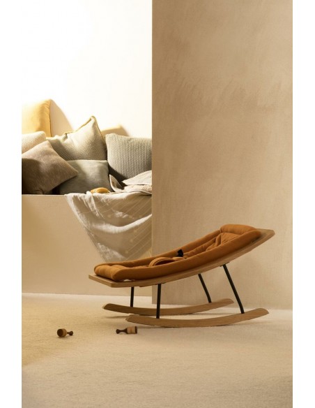 Rocking Baby Bouncer fra Belgiske Quax, udført i et moderne design og fremstillet i lækre materialer. Stolen måler 41 cm i højden og kommer med blød hynde med sikkerhedsspænde.