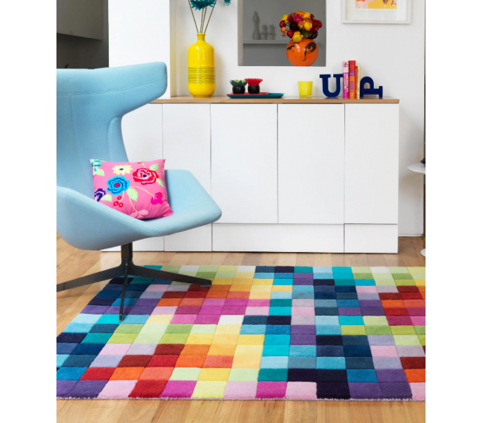 Dekorativt løst tæppe til børneværelset eller stuen, udført i et design af 100% uld. Tæppet måler 120 x 180 cm i bredde og dybde.