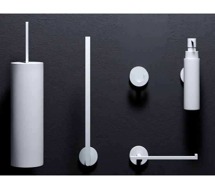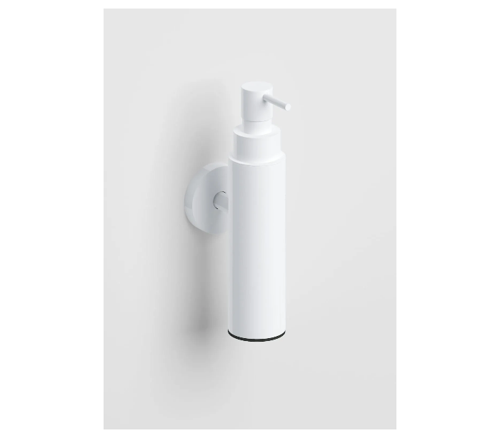 Vægmonteret sæbedispenser i et design af mat hvidlakeret metal. Sæbedispenseren måler 17,55 cm i højden.