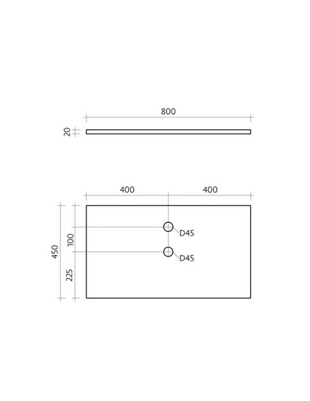 Topplade med afløbshul og armaturhul, udført i et design af keramik i sort marmorlook. Pladen måler 2 cm i højden og 80 x 45 cm i bredde og dybde.
