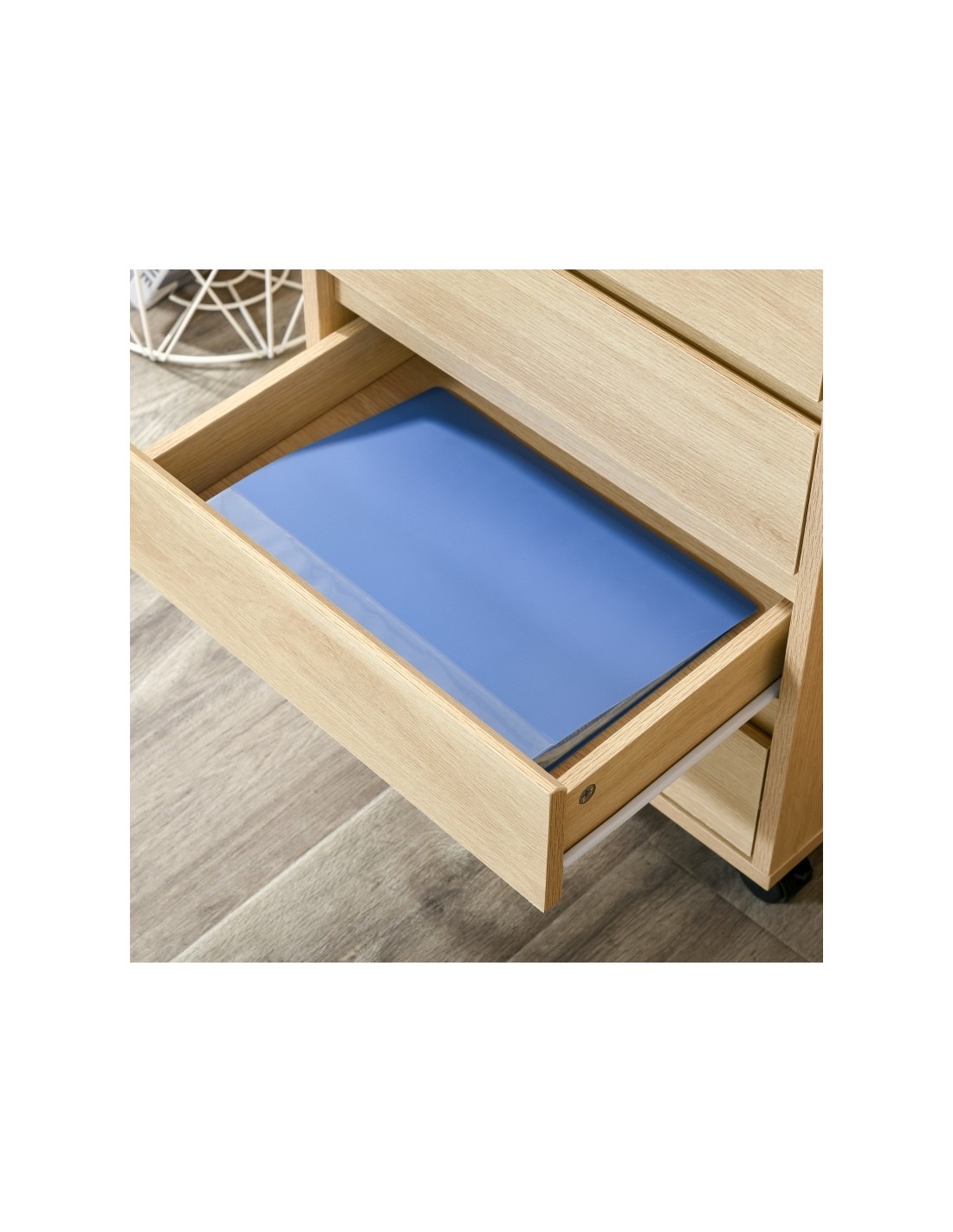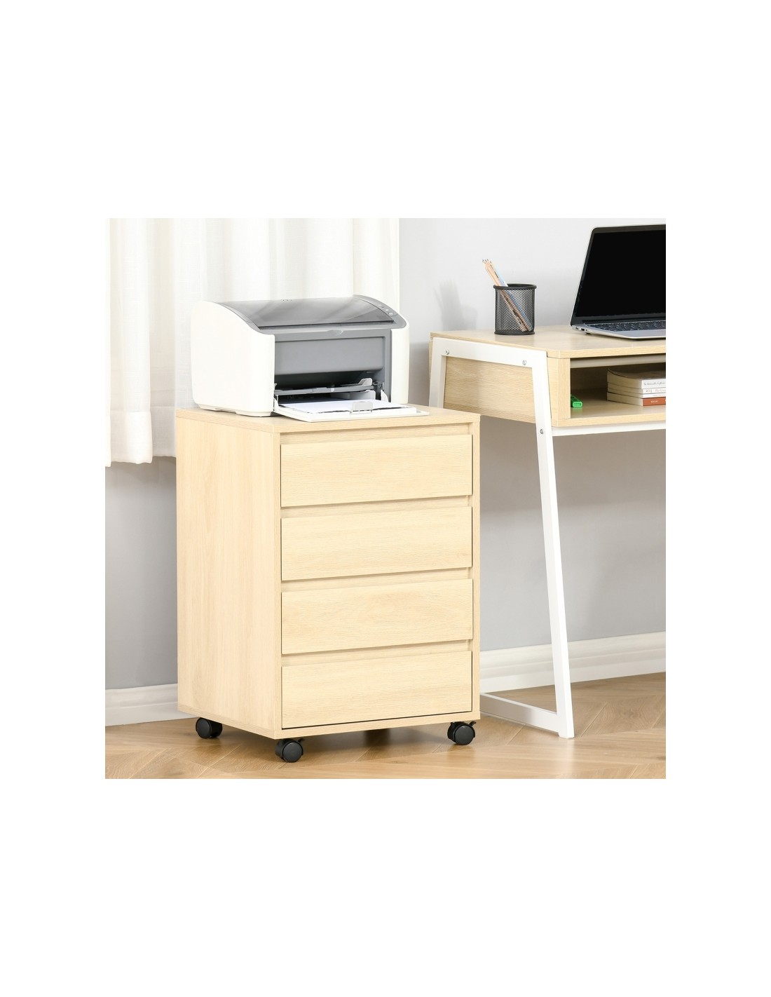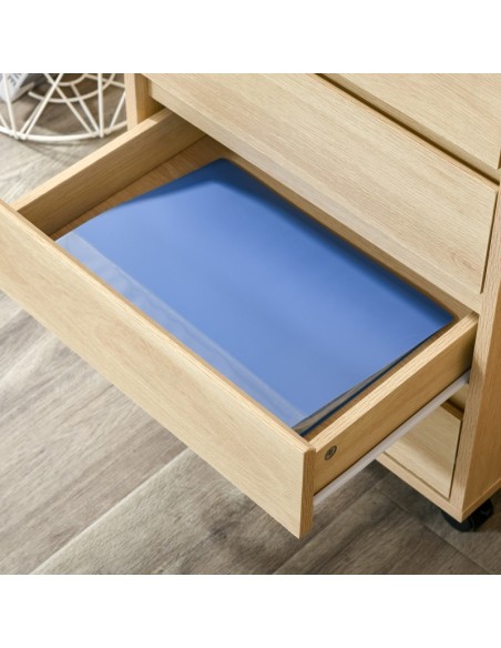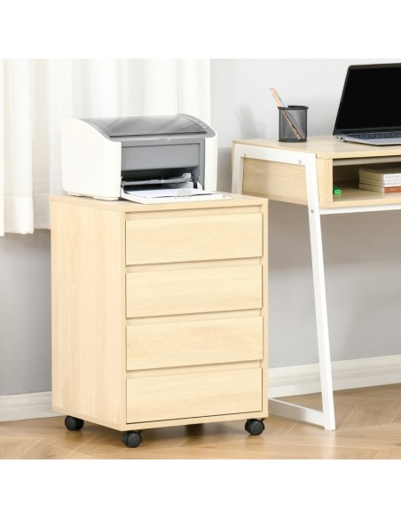 Skuffesektion på hjul med 4 skuffer. Skuffesektionen er fremstillet i MDF og måler 65 cm i højden og 46 x 40 cm i bredde og dybde.