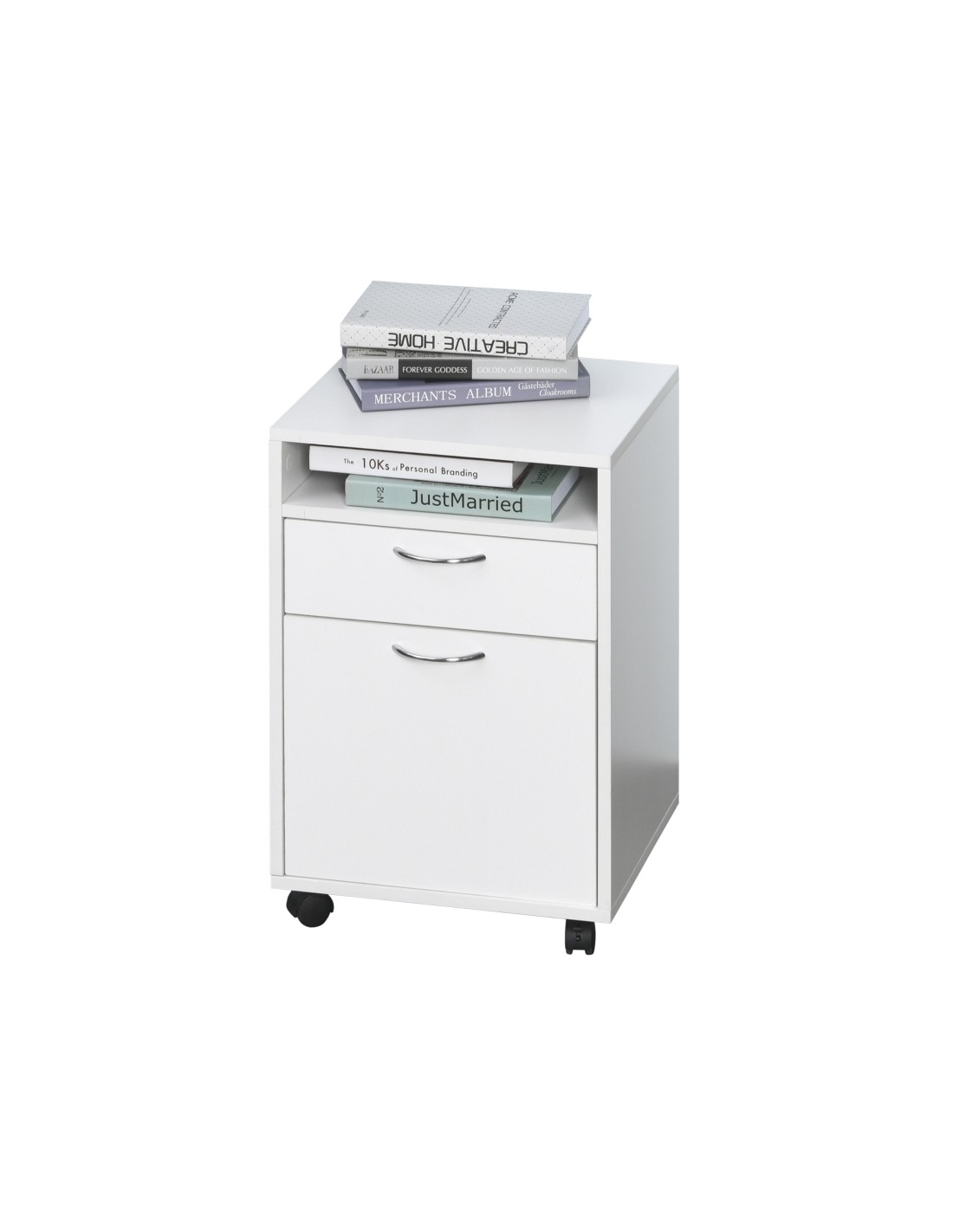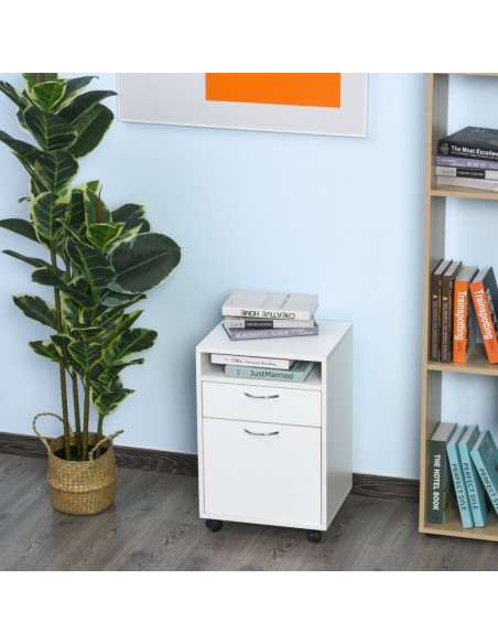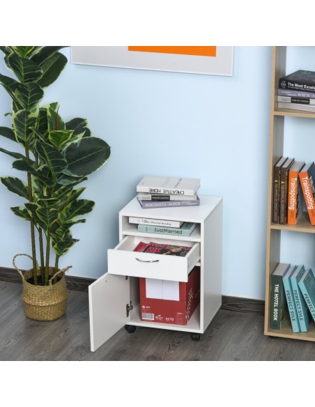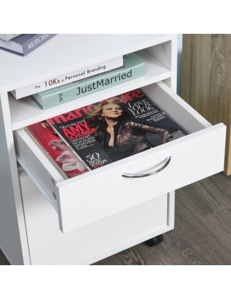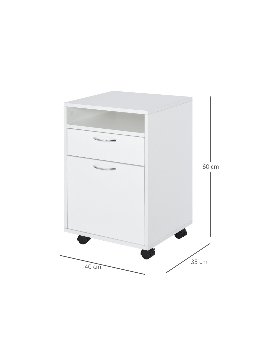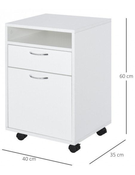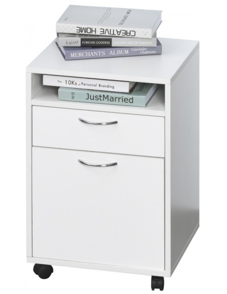 Skuffesektion på hjul med 1 skab, 1 åbent hylderum og 1 skuffe. Skuffesektionen er fremstillet i møbelplade og måler 60 cm i højden og 40 x 35 cm i bredde og dybde.