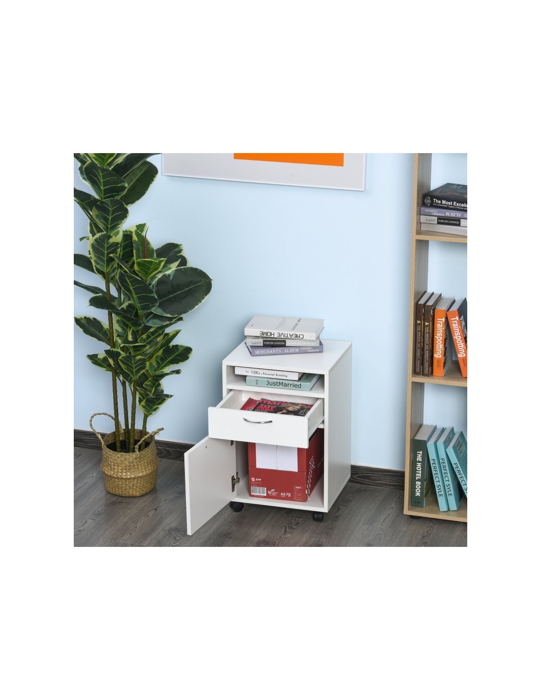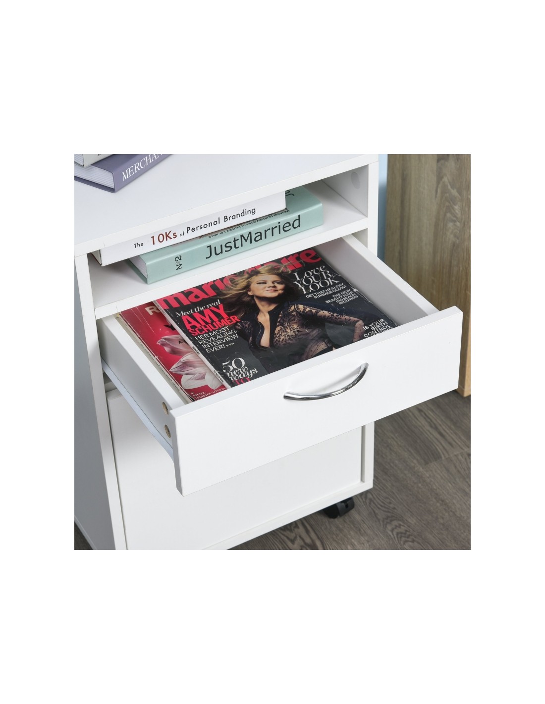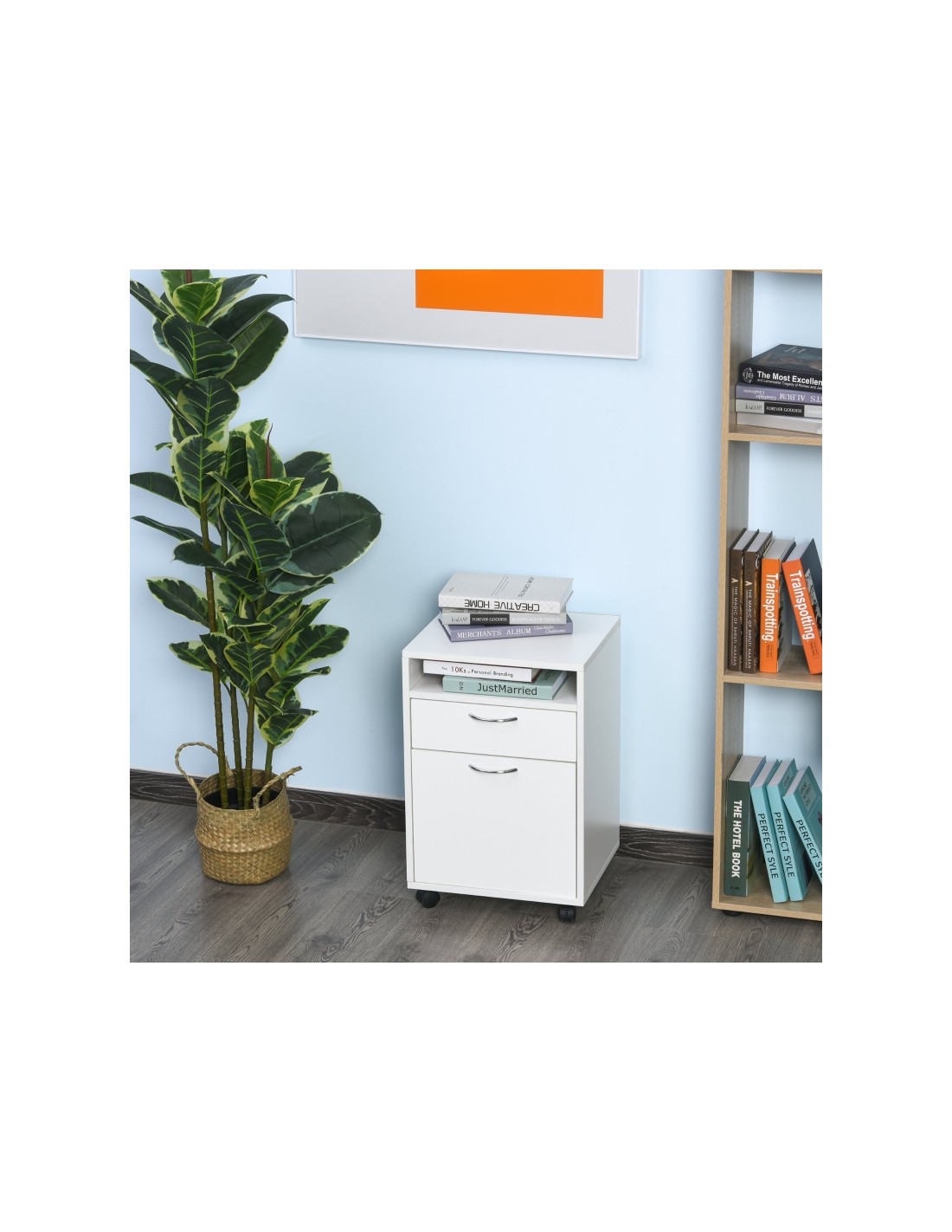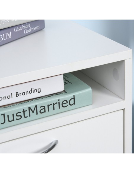 Skuffesektion på hjul med 1 skab, 1 åbent hylderum og 1 skuffe. Skuffesektionen er fremstillet i møbelplade og måler 60 cm i højden og 40 x 35 cm i bredde og dybde.