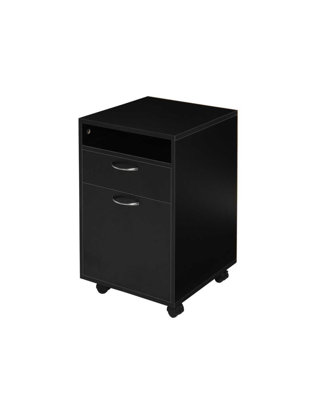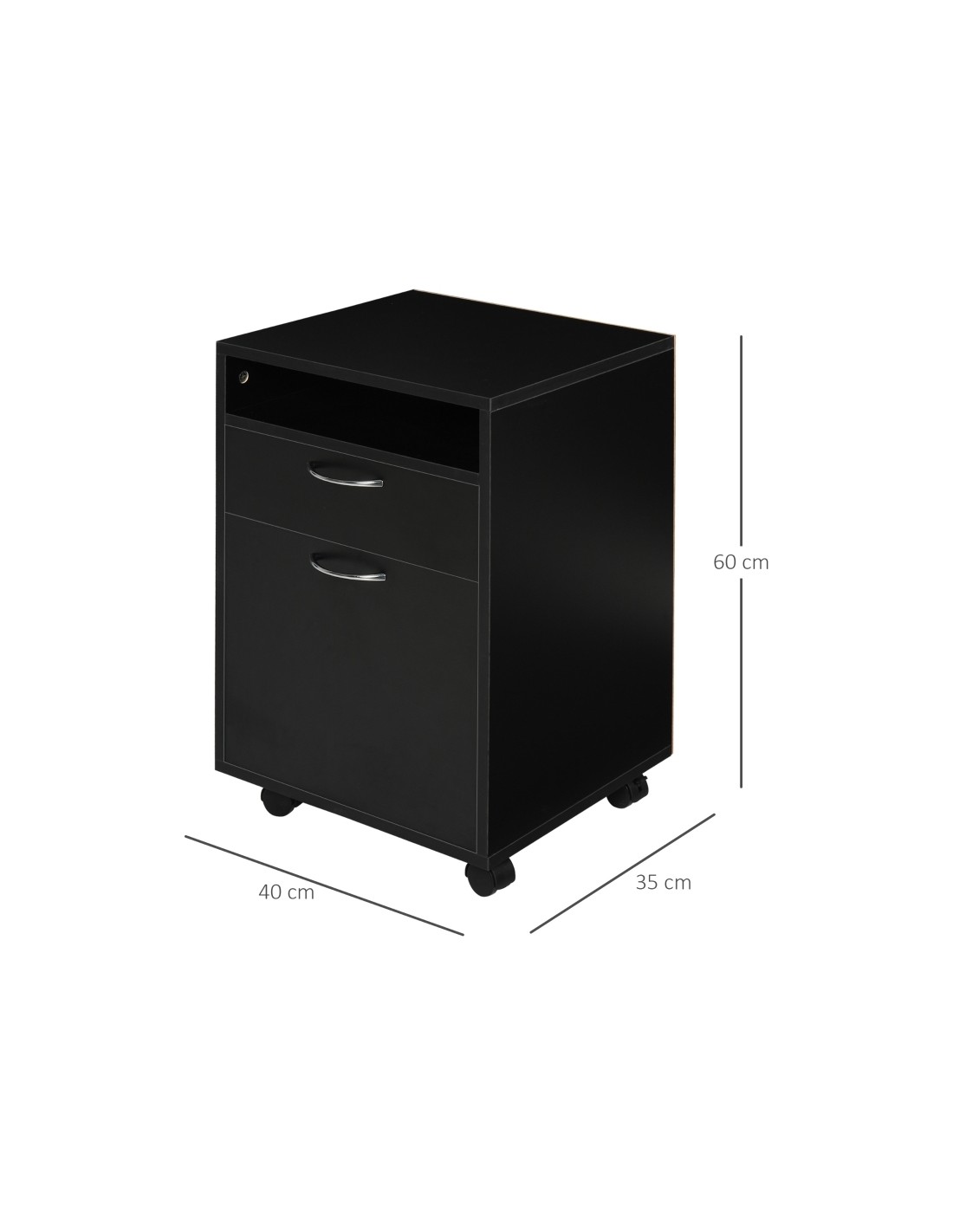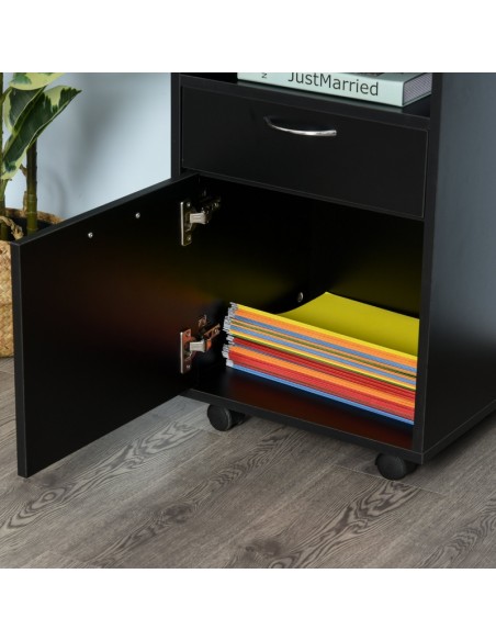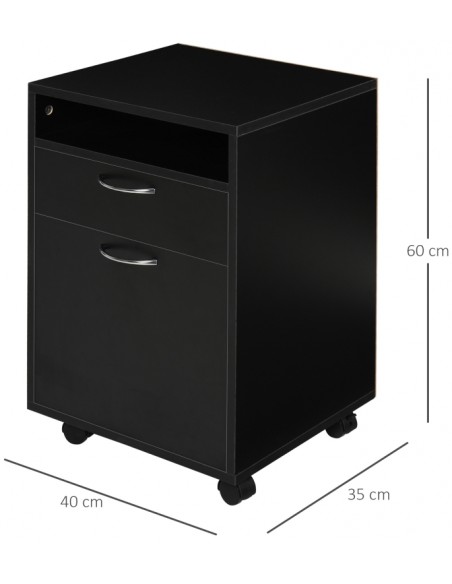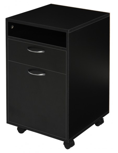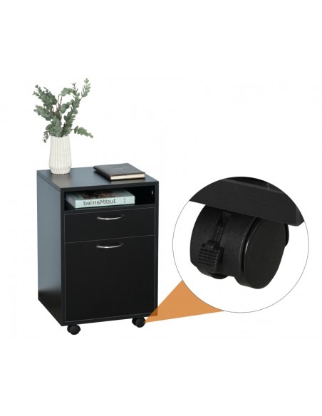 Skuffesektion på hjul med 1 skab, 1 åbent hylderum og 1 skuffe. Skuffesektionen er fremstillet i møbelplade og måler 60 cm i højden og 40 x 35 cm i bredde og dybde.