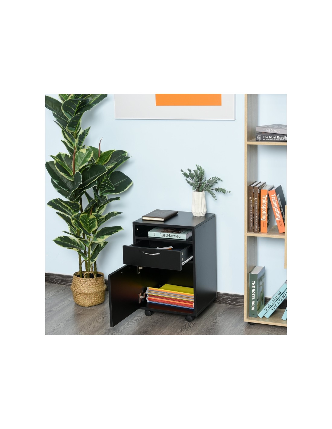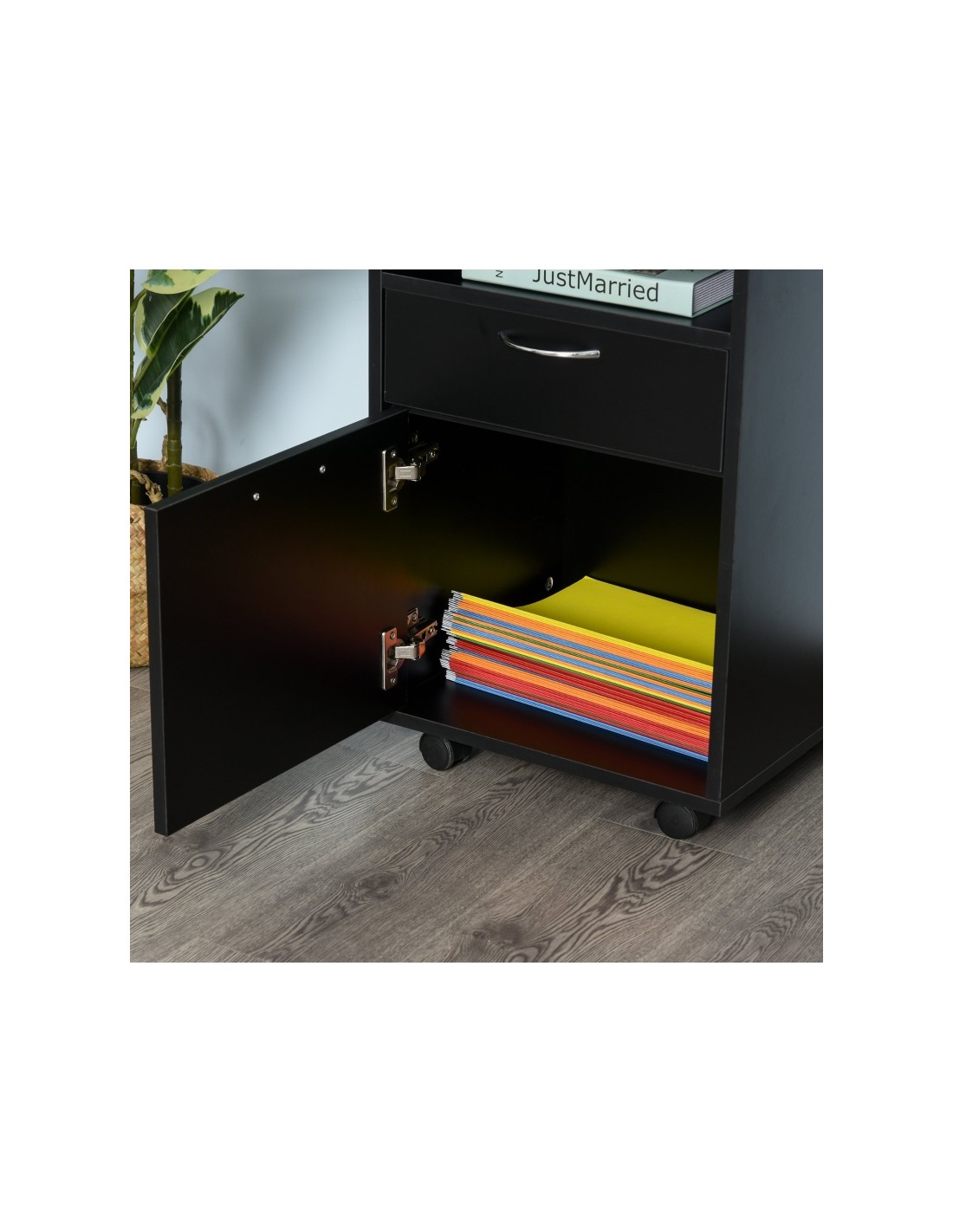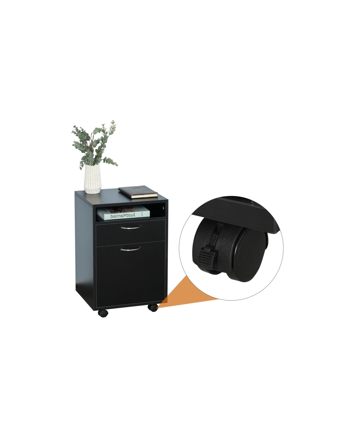 Skuffesektion på hjul med 1 skab, 1 åbent hylderum og 1 skuffe. Skuffesektionen er fremstillet i møbelplade og måler 60 cm i højden og 40 x 35 cm i bredde og dybde.