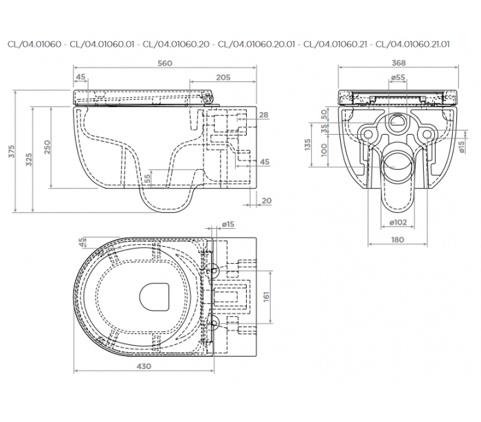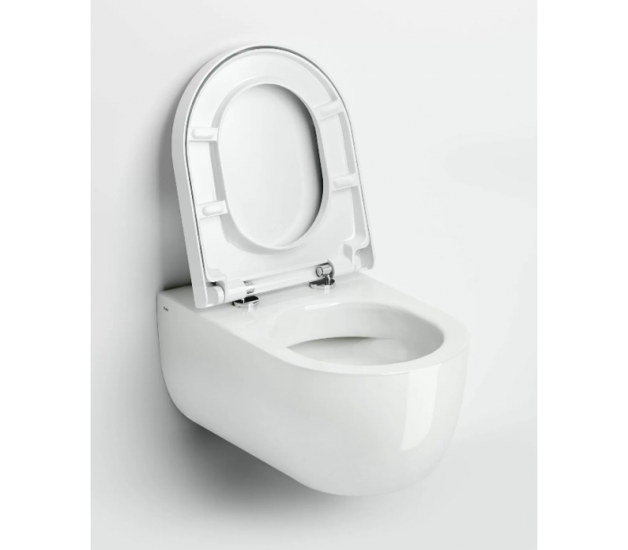 Væghængt toilet udført i et design af hvid højglans keramik. Toilettet måler 37,5 cm i højden og 36,8 x 56 cm i bredde og dybde. Der medfølger toiletsæde med cover med soft close samt monteringssæt.