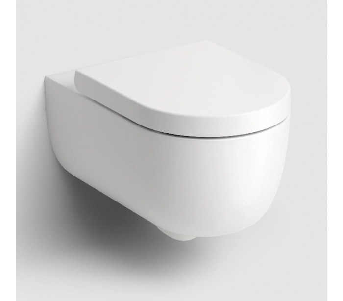 Væghængt toilet udført i et design af mat hvid keramik. Toilettet måler 37,5 cm i højden og 36,8 x 56 cm i bredde og dybde. Der medfølger toiletsæde med cover med soft close samt monteringssæt.