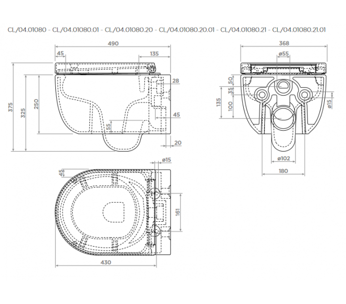 Væghængt toilet udført i et design af mat hvid keramik. Toilettet måler 37,5 cm i højden og 36,8 x 49 cm i bredde og dybde. Der medfølger toiletsæde med cover med soft close samt monteringssæt.
