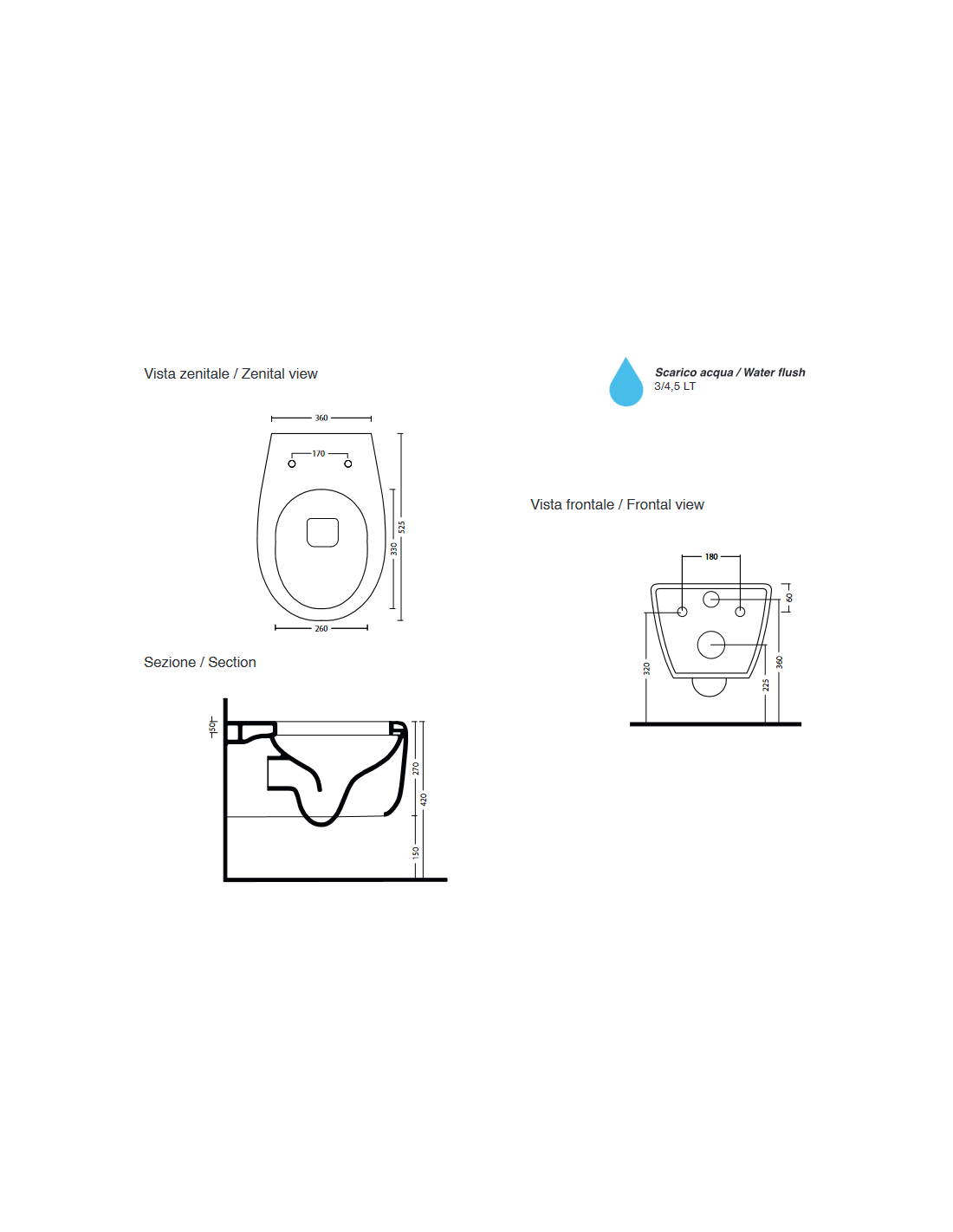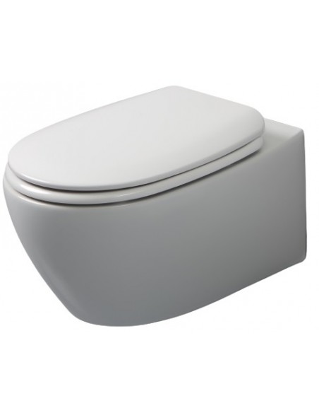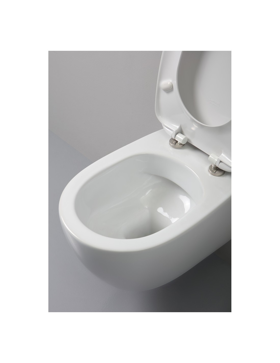 Væghængt toilet udført i et design af blank hvid keramik. Toilettet måler 52,5 cm i dybden og er rimless for lettere rengøring. Der medfølger toiletsæde med cover med soft close samt monteringssæt.