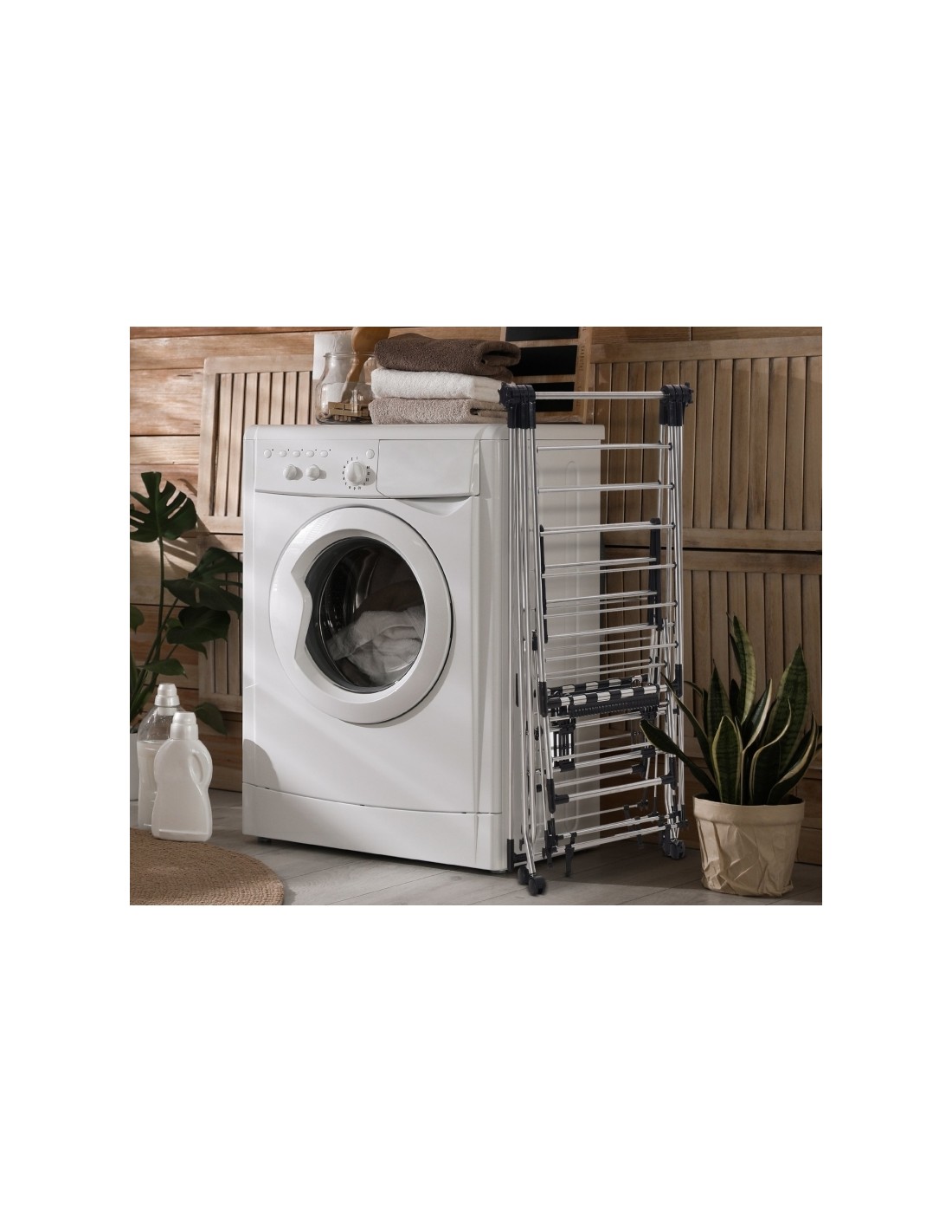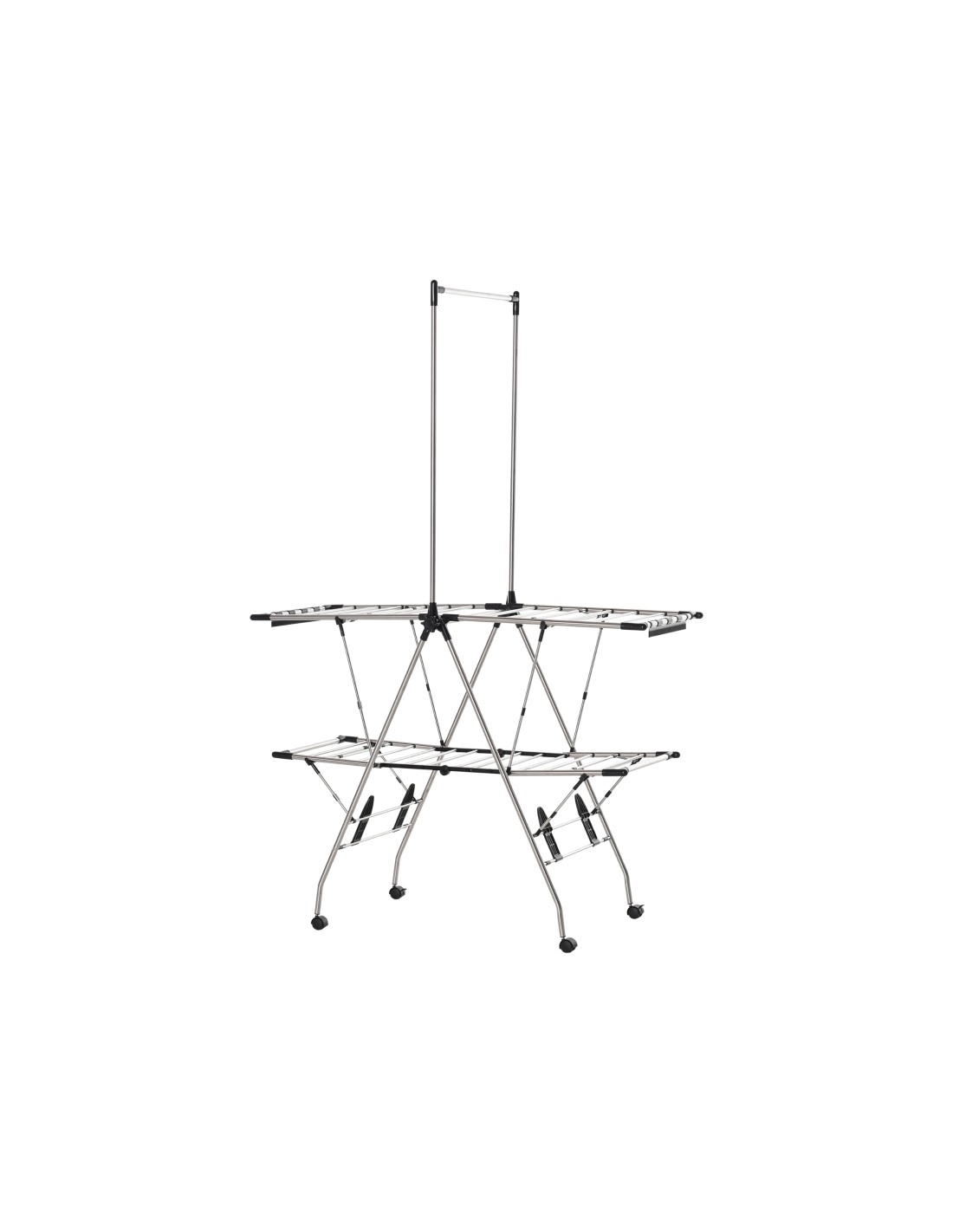 Tørrestativ med flere funktioner, udført i stål og kunststof. Tørrestativet kan foldes sammen, således det fylder begrænset. Stativet måler udslået 138,5 x 63 cm i bredde og dybde og 208 cm i højden. Stativet kan holde både sko, skjorter, trøjer og strømer med mere, og leveres med 27 klemmer og hjul.