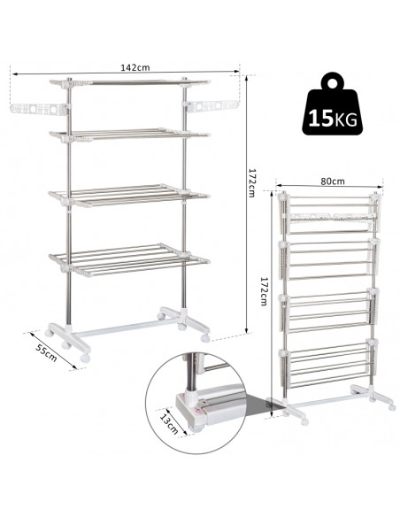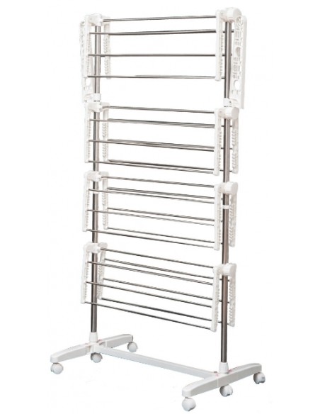 Tørrestativ udført i stål og kunststof. Tørrestativet kan foldes sammen, således det fylder begrænset. Stativet måler udslået 80/142 x 55 cm i bredde og dybde og 172 cm i højden. Dertil har stativet hjul for lettere håndtering.