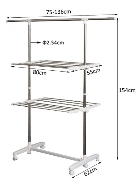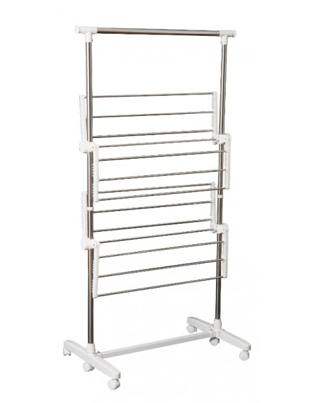Tørrestativ udført i stål og kunststof. Tørrestativet kan foldes sammen, således det fylder begrænset. Stativet måler udslået 75/136 x 62 cm i bredde og dybde og 154 cm i højden. Dertil har stativet hjul for lettere håndtering.