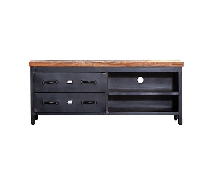 Tvbord i et industrielt design, fremstillet i mangotræ og sortlakeret metal. Tvbordet måler 135 x 42 cm i bredde og dybde og kommer med 2 skuffer og 2 hylderum.