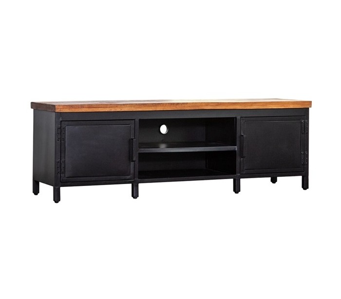 Tvbord i et industrielt design, fremstillet i mangotræ og sortlakeret metal. Tvbordet måler 170 x 42 cm i bredde og dybde og kommer med 2 skabe og 2 hylderum.