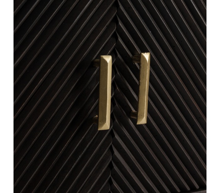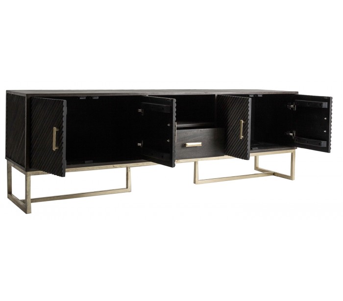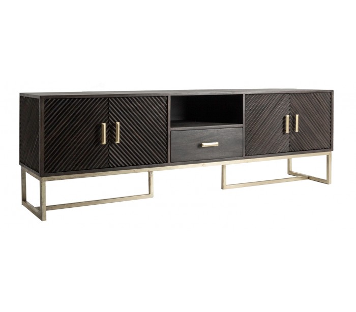 Tvbord i et rustikt design, fremstillet af mangotræ og jern. Tvbordet måler 65 cm i højden og 200 cm i bredden og indeholder 2 skabe samt 1 hylderum og 1 skuffe. Bemærk venligst, at der jf. det rustikke design, kan være små ujævnheder.