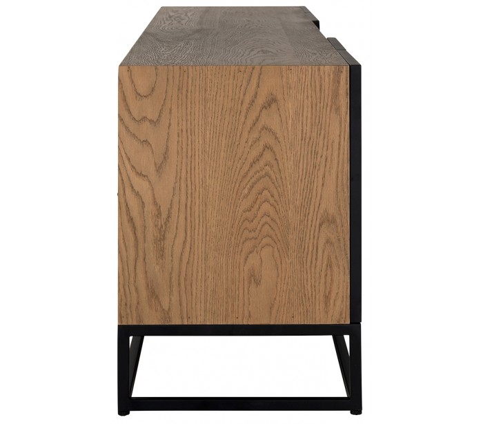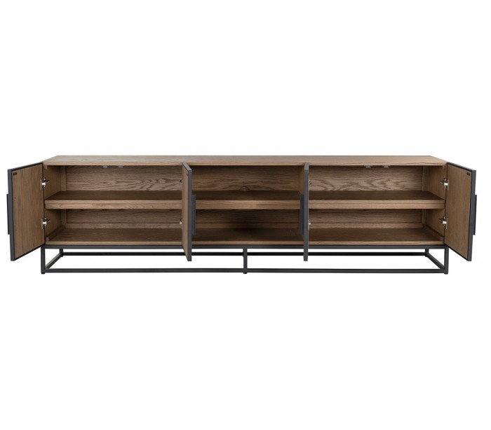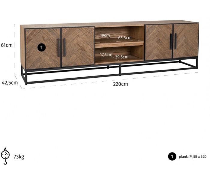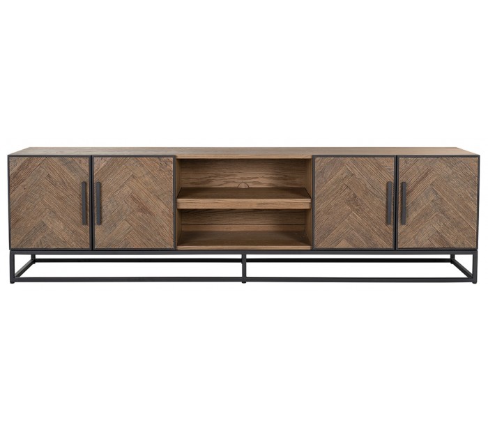 Tvbord i et design fra hollandske Richmond Interiors. Tvbordet er fremstillet med kabinet i genanvendt egetræ og stel i sortlakeret metal. Tvbordet måler 220 x 42,5 cm i bredde og dybde og 61 cm i højden.