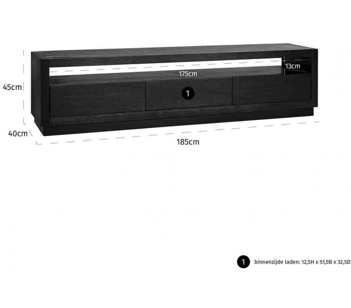 Tvbord i et design fra hollandske Richmond Interiors. Tvbordet er fremstillet i sort egetræsfinér og måler 185 x 40 cm i bredde og dybde og 45 cm i højden. Tvbordet indeholder 3 skuffer.