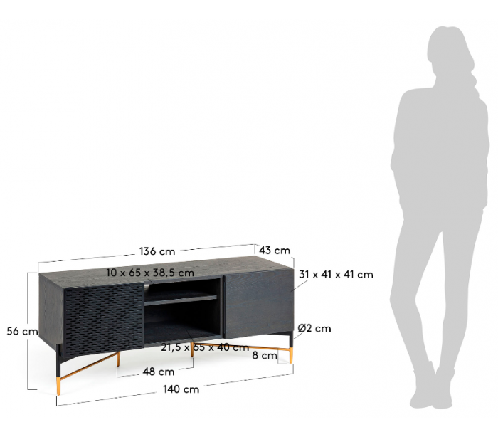 Tvbord med 1 skab med hylderum, samt 1 dobbeltskab med 1 skydelåge, udført i et skandinavisk design fra LaForma. Tvbordet er fremstillet i mdf og ask finér og måler 136 cm i bredden.