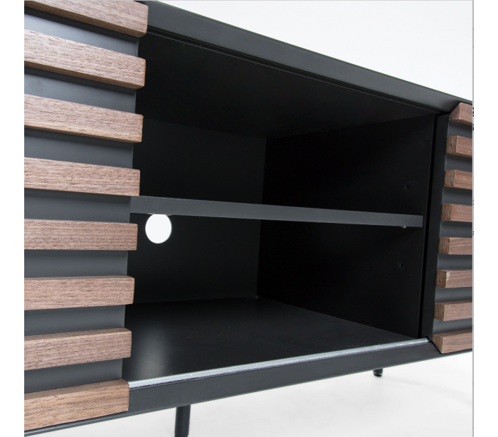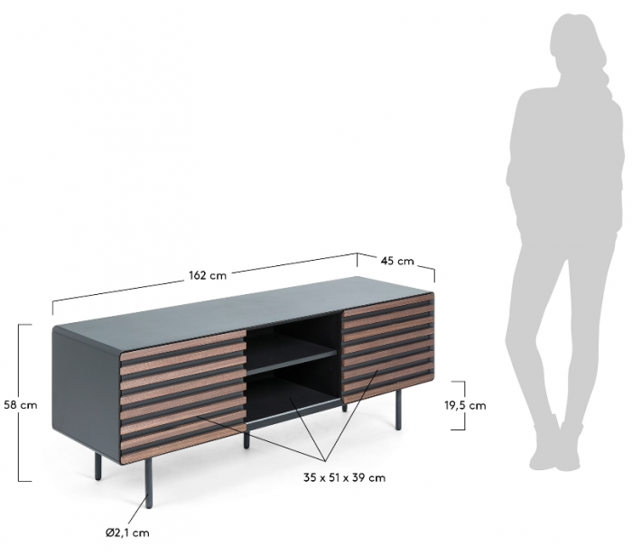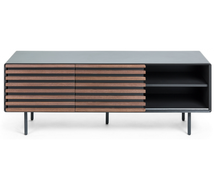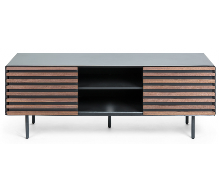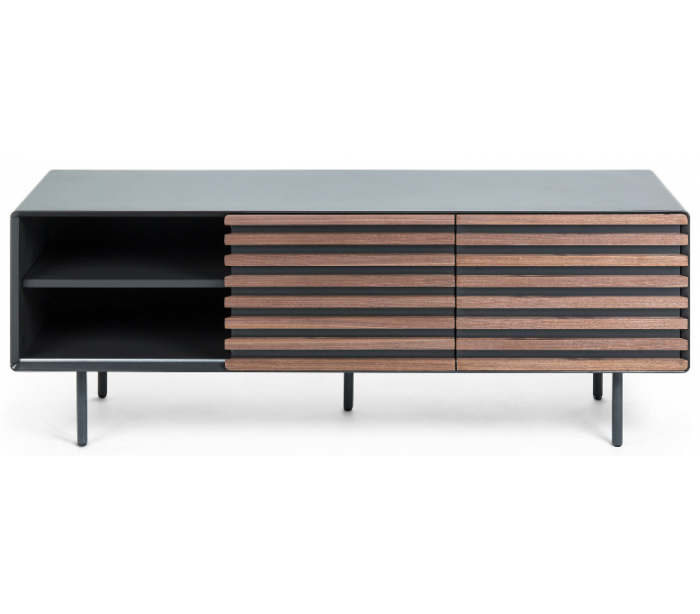 Tvbord med 2 skydelåger og i alt 6 hylderum, udført i et skandinavisk design fra LaForma. Tvbordet er fremstillet i mdf og valnødde finér og måler 162 cm i bredden.
