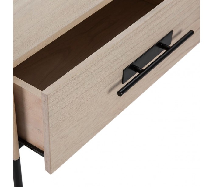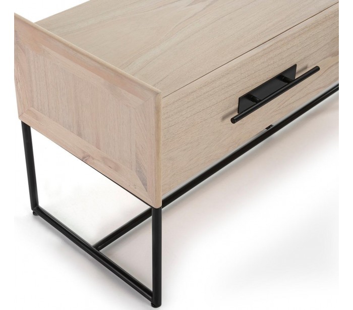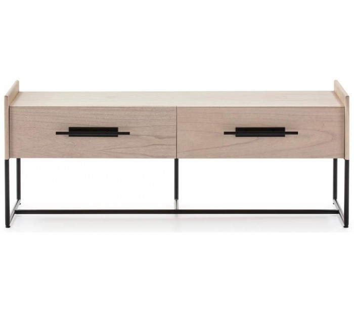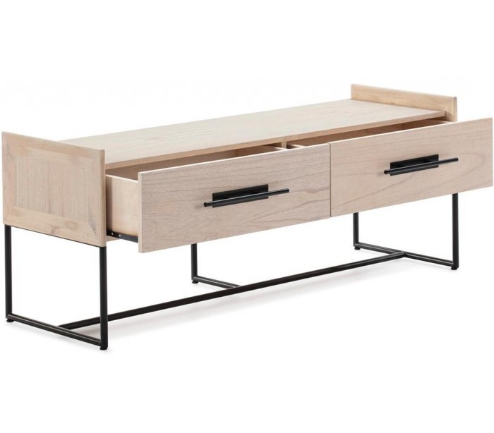 Tvbord udført i et design af naturfarvet træ og med stel i sortlakeret metal. Grebene er udført i sortlakeret metal. Tvbordet kommer med 2 skuffer og måler 140 cm i bredden og 55 cm i højden.