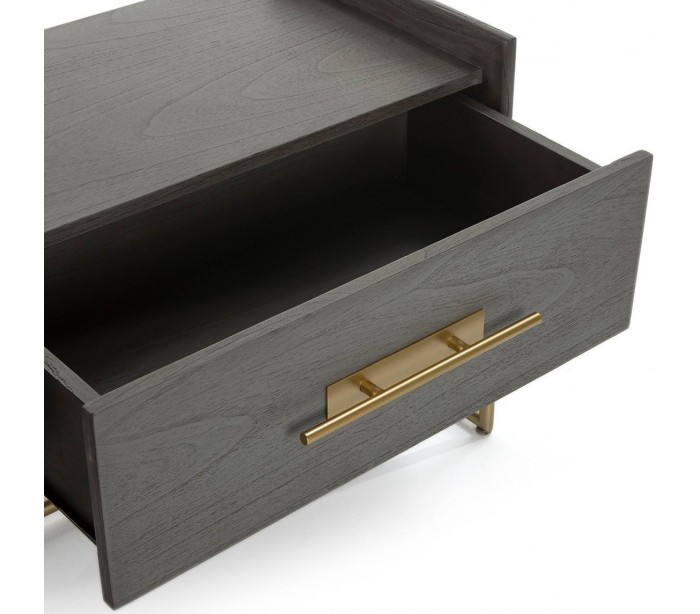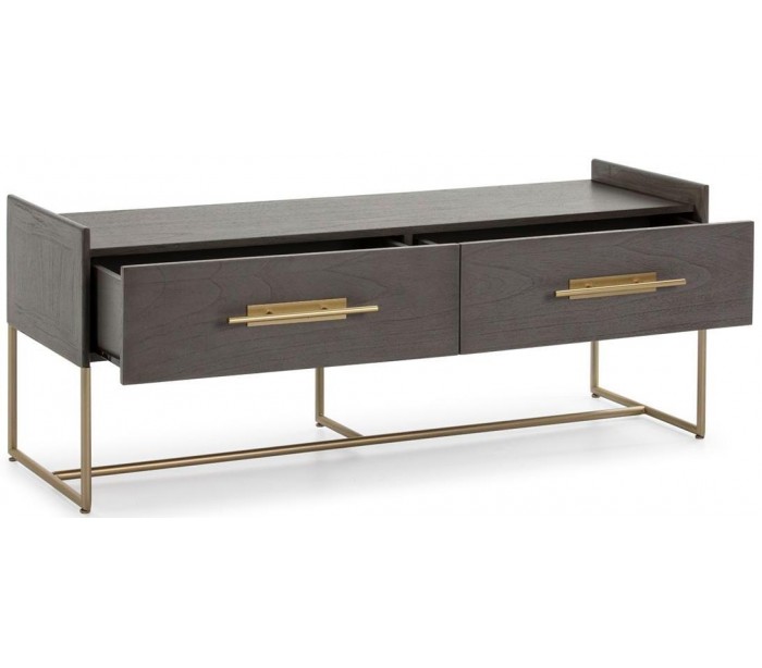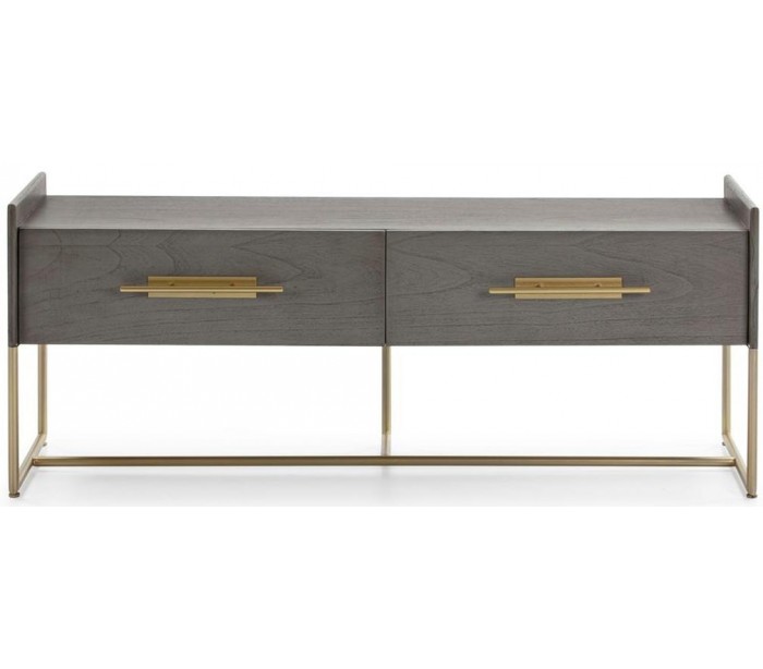 Tvbord udført i et design af grålakeret træ og med stel i antik guldfarvet metal. Grebene er udført i antik guldfarvet metal. Tvbordet kommer med 2 skuffer og måler 140 cm i bredden og 55 cm i højden.