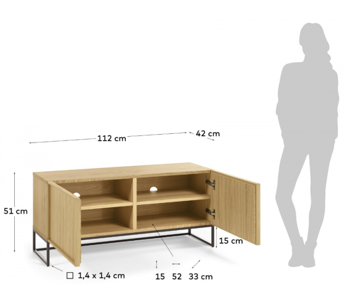 Tvbord med i alt 4 hylderum, udført i et moderne skandinavisk design fra LaForma. Tvbordet er fremstillet i sortlakeret metal og egetræsfinér samt mdf og måler 112 cm i bredden.
