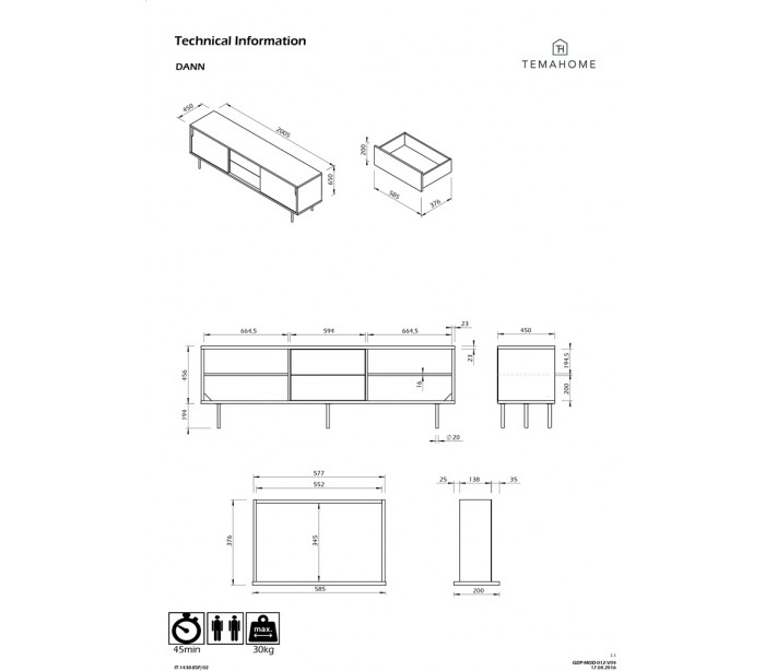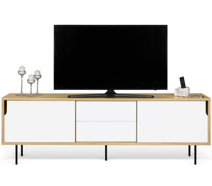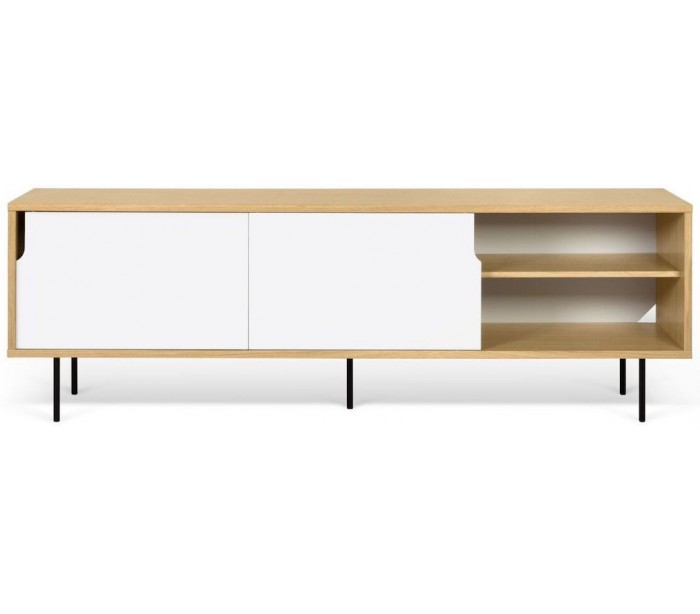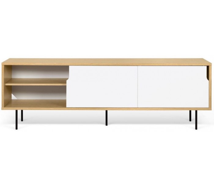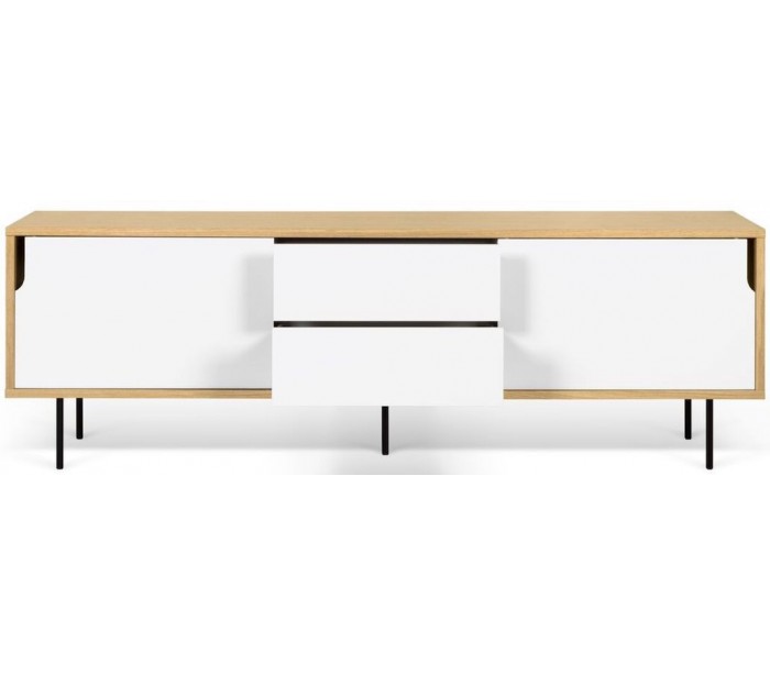 TemaHome Dann tvbord udført i et design af mat hvid og egetræsfarvet MDF med ben i sortlakeret metal. Tvbordet måler 65 cm i højden og 201 x 45 cm i bredde og dybde. Tvbordet indeholder 2 skydelåger, hvert med 2 hylderum bag lågen - hertil 2 skuffer med push open funktion.